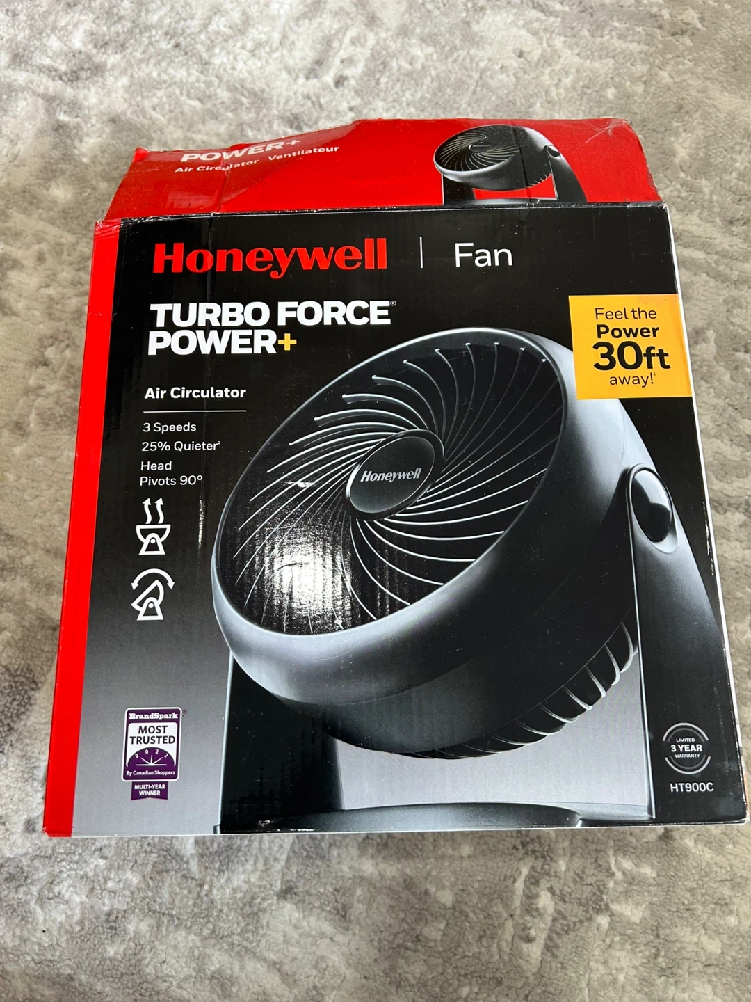 10Selling a Honeywell Turbo Force POWER+ fan, model HT900C. It's an air circulator with 3 speeds and is 25% quieter. The head pivots 90°. Feel the power 30ft away! Comes with the original box. I bought a new fan so I am selling it.