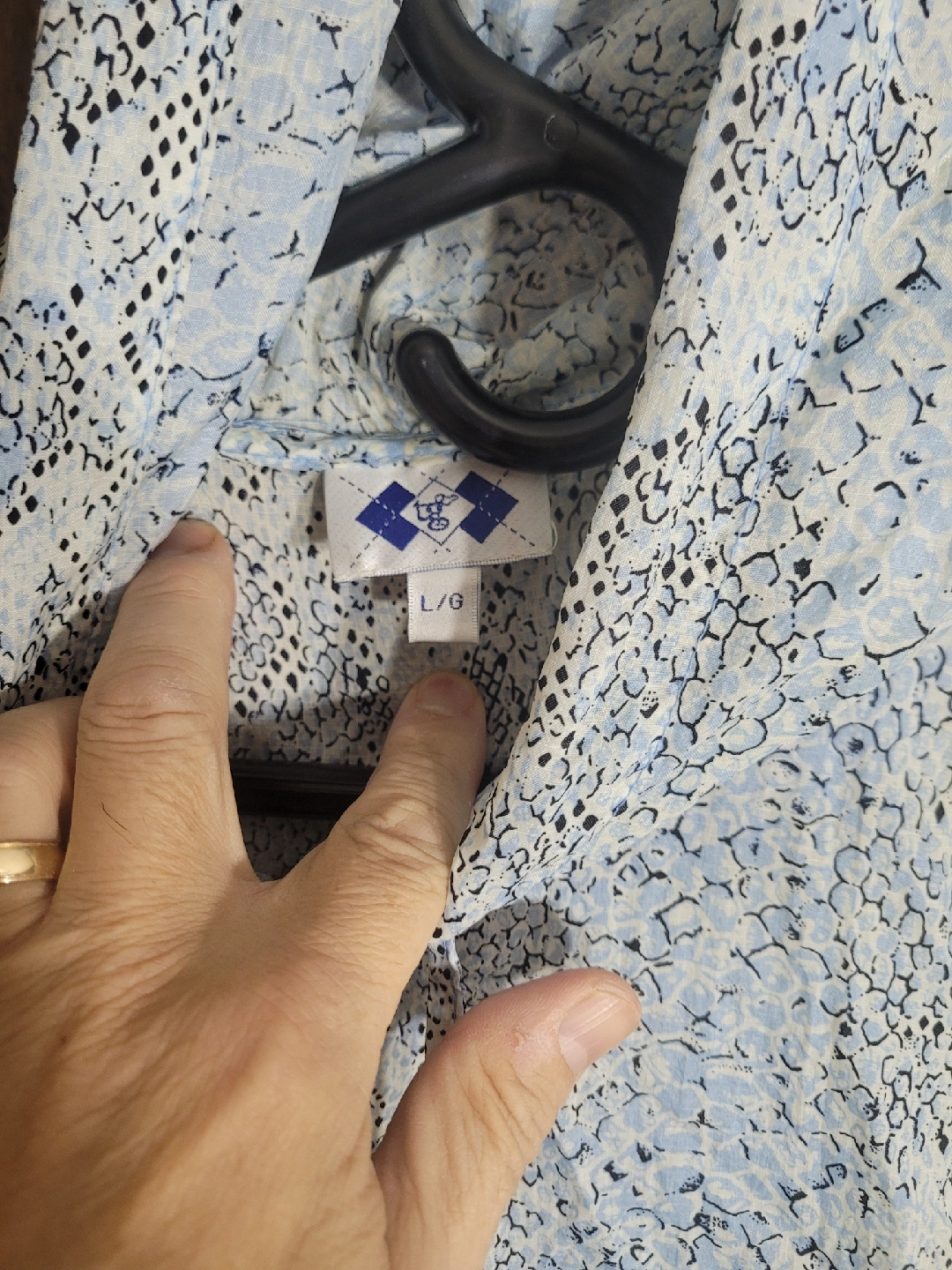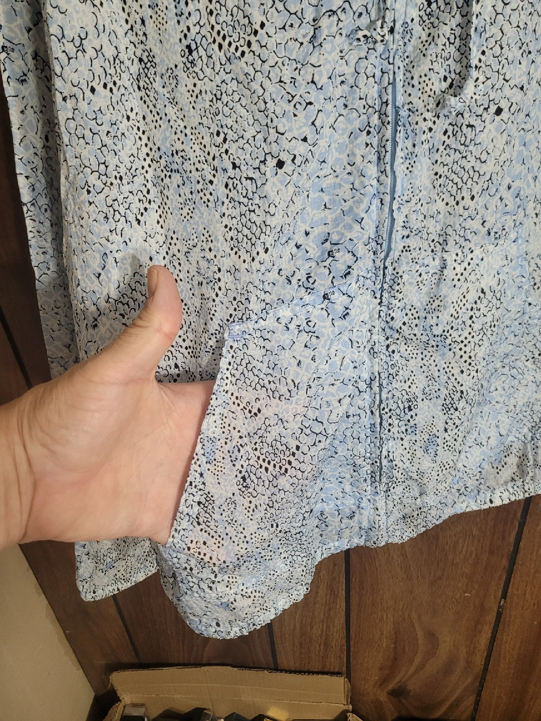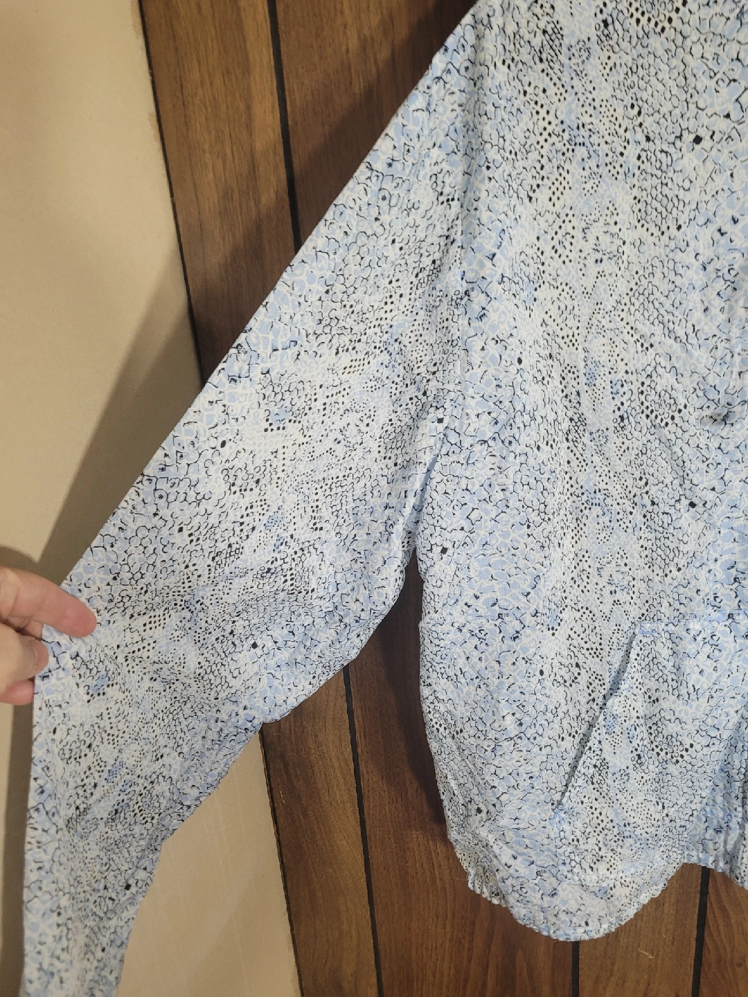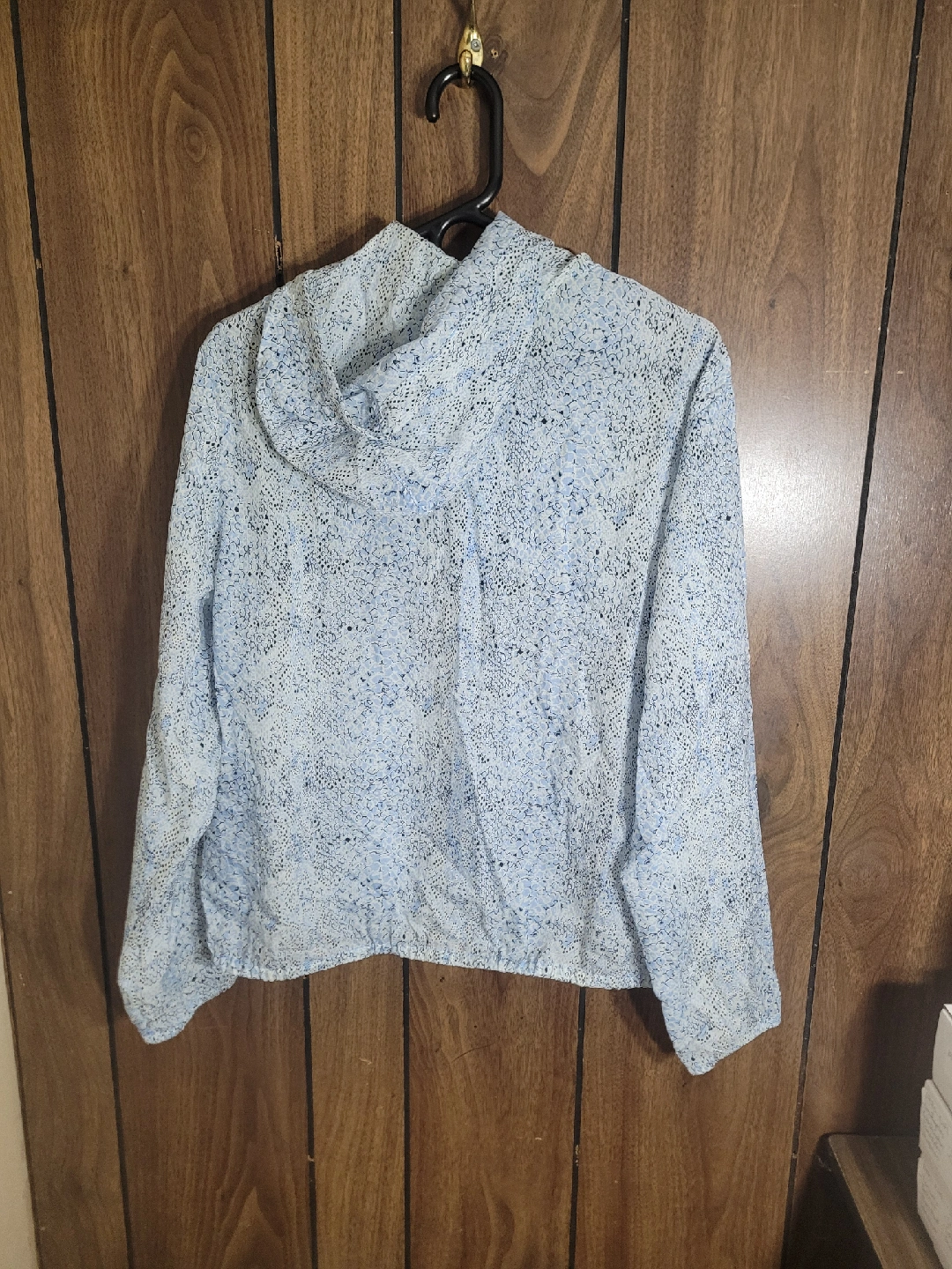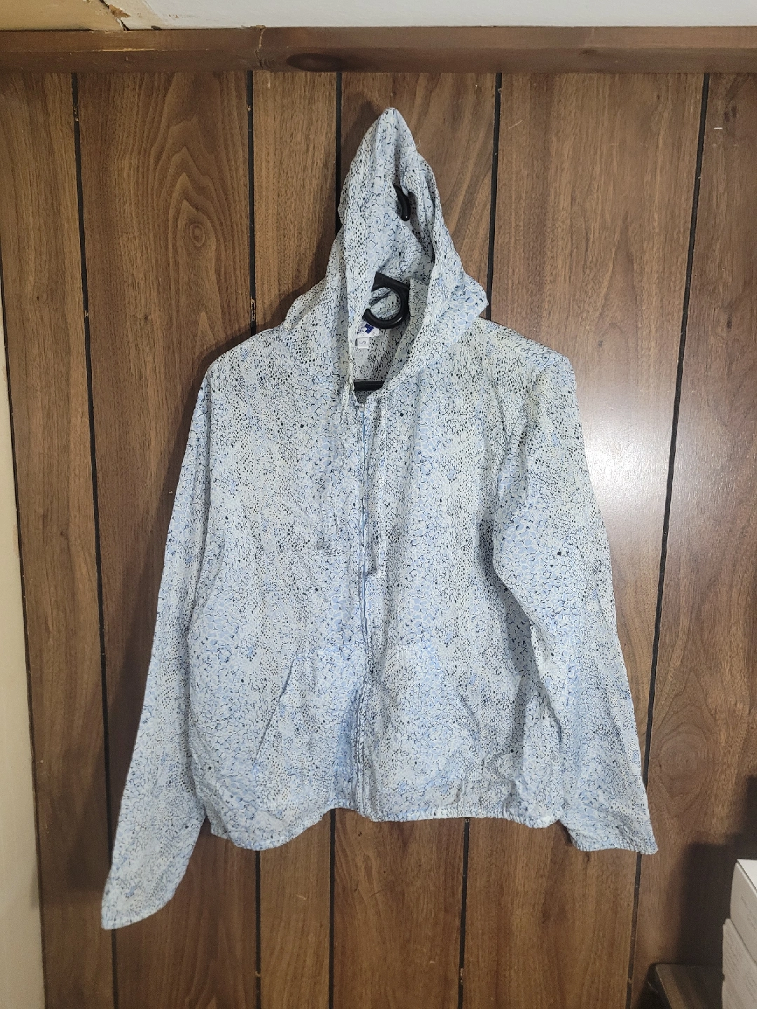 Selling a lightweight hooded windbreaker jacket in size L/G. The jacket is made of 100% nylon and features a unique print. It's perfect for those breezy days!