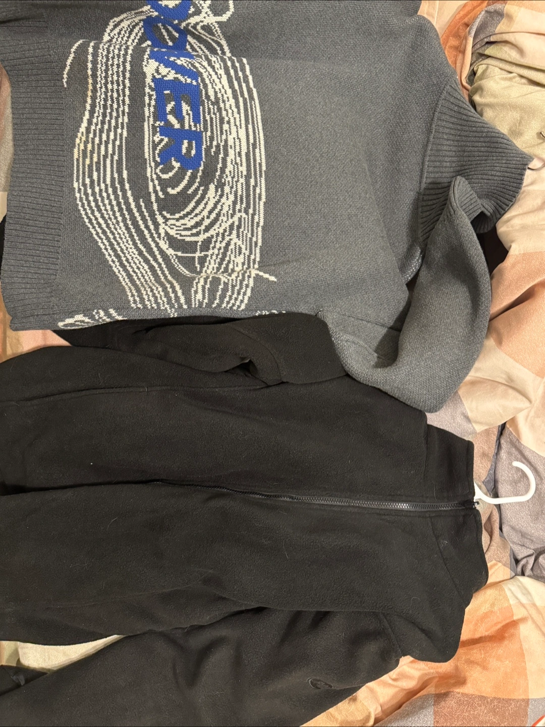 32Five different hoodies and sweaters. Colour variations include grey, black, red, and white. Various styles and designs. Good condition.