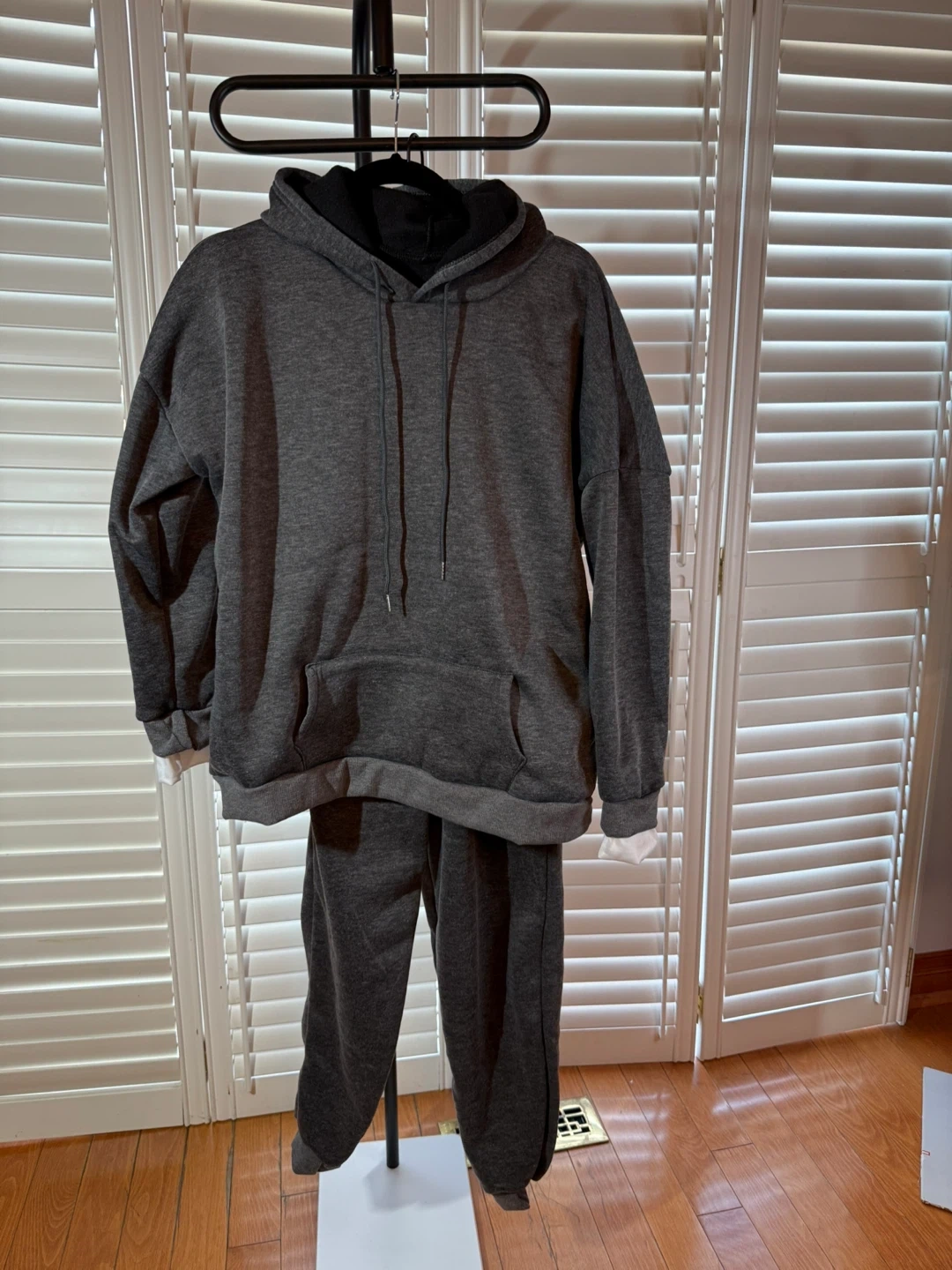 20Selling a comfy hoodie and sweatpants set! The set includes a hoodie with a drawstring and a pair of matching sweatpants. Perfect for lounging around the house or running errands