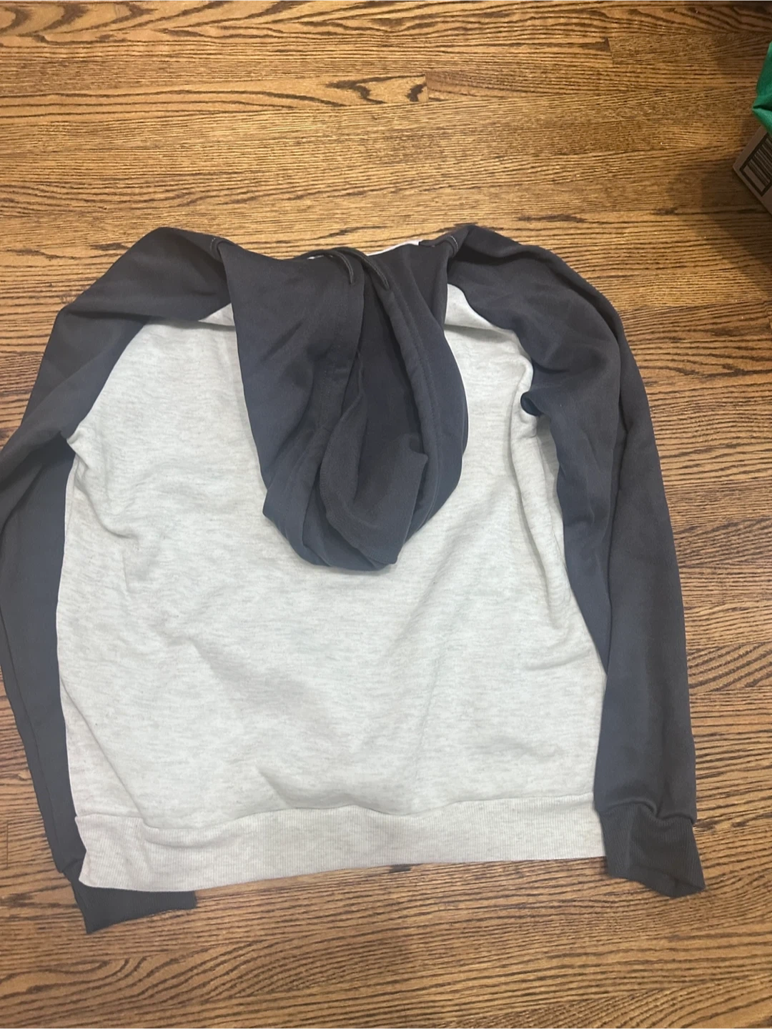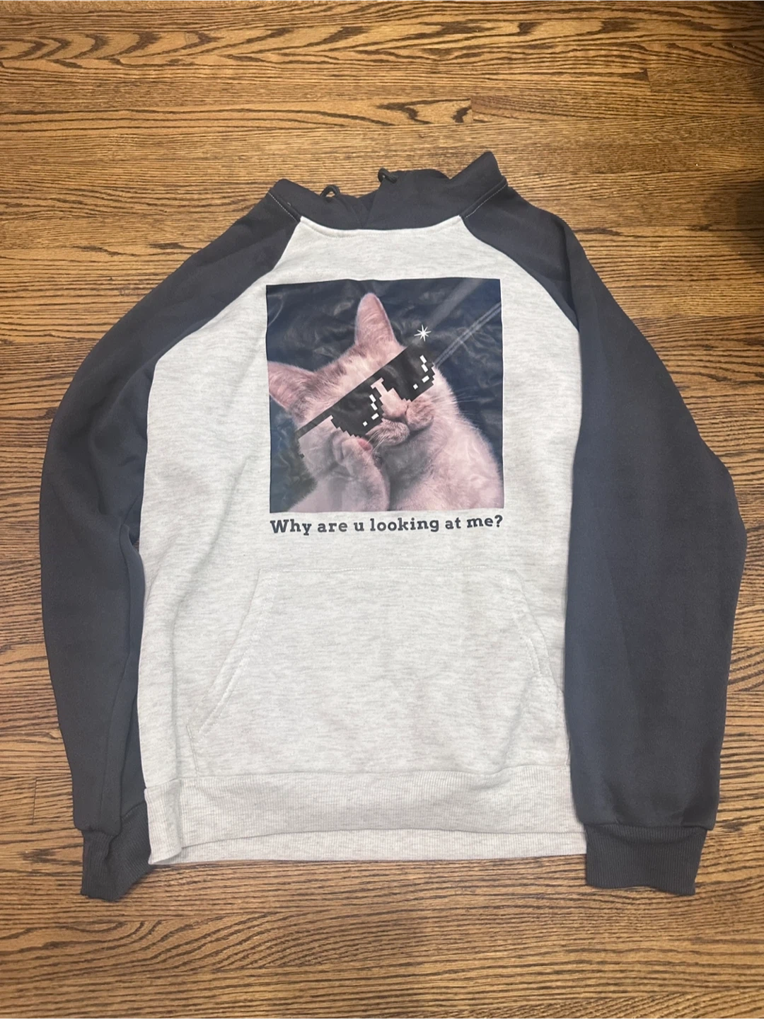 86Selling a hoodie with a cool cat graphic on the front! The hoodie is a light grey colour with dark grey sleeves and hood. It's in great condition and perfect for casual wear