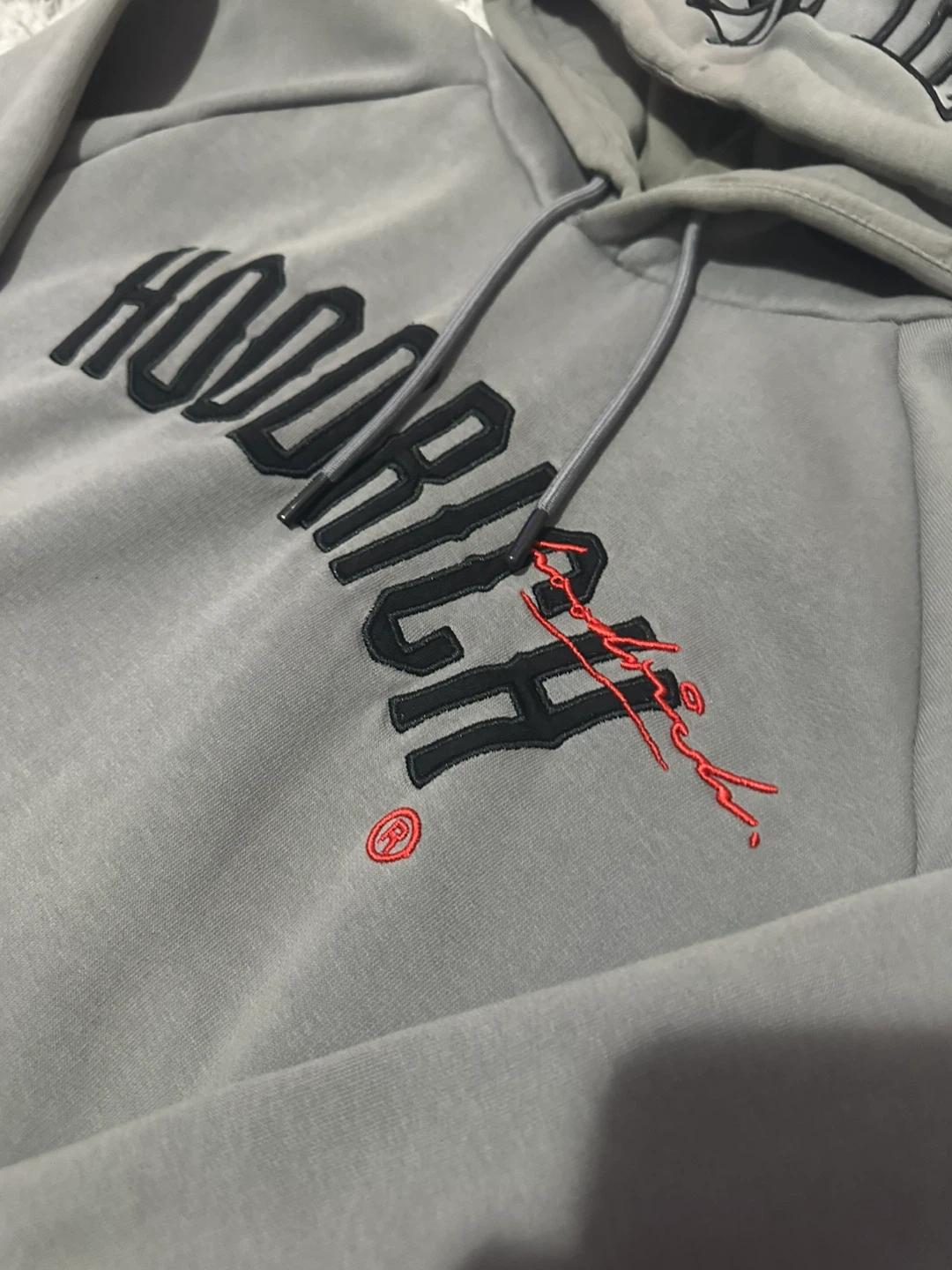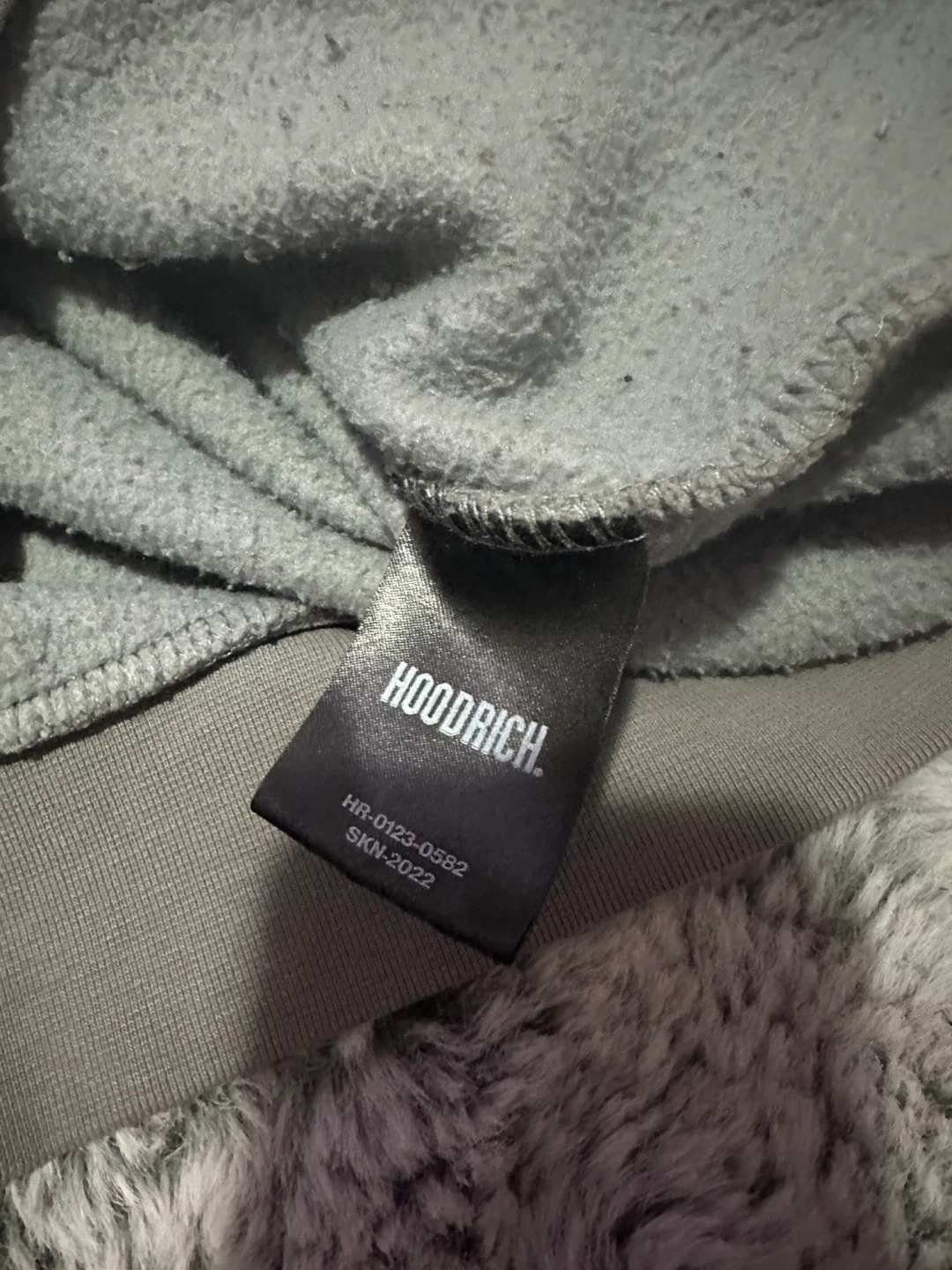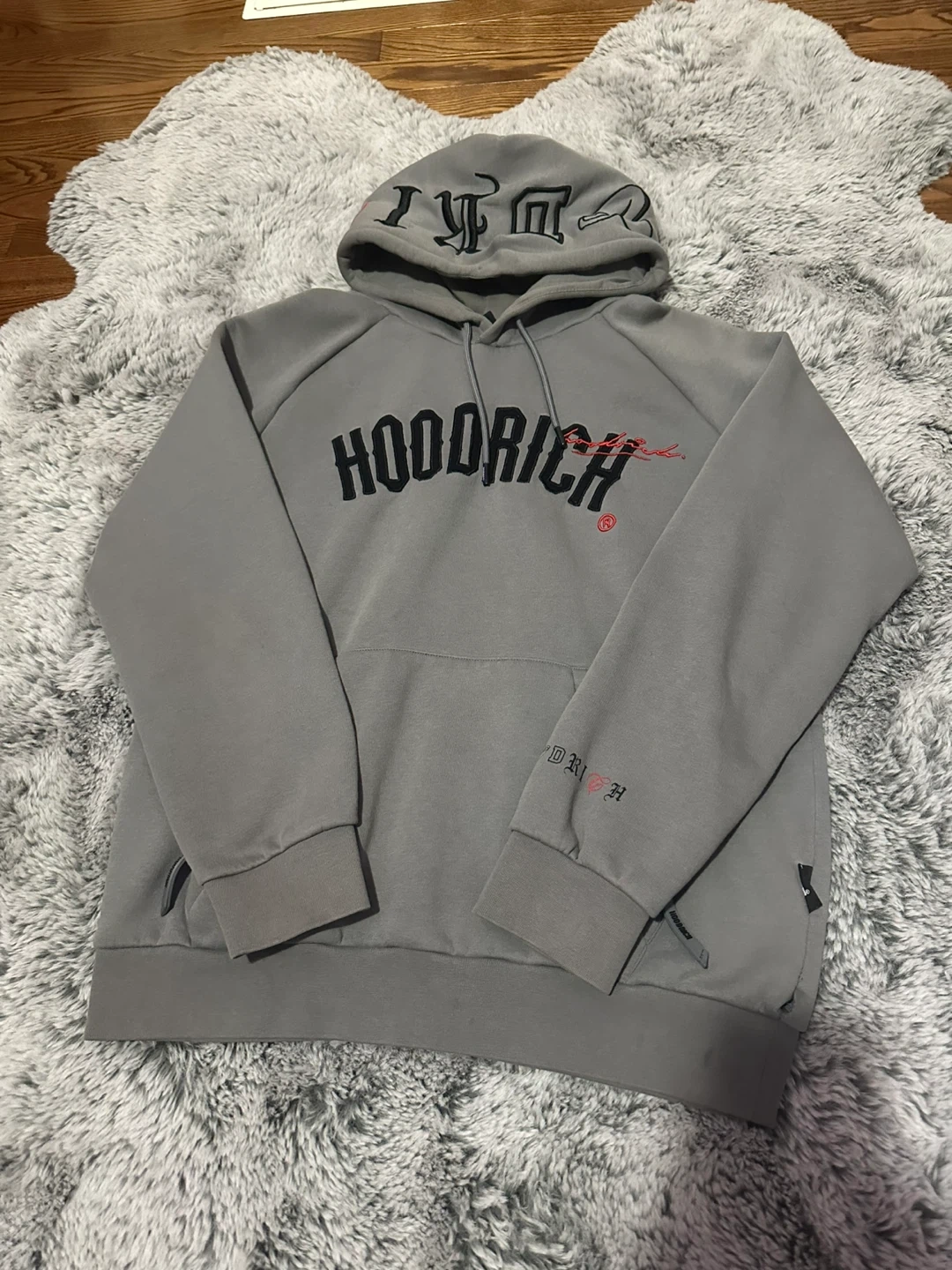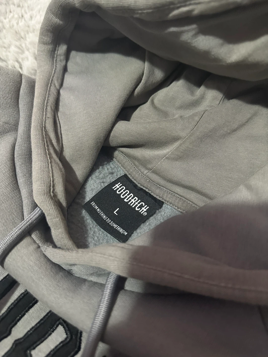Selling a Hoodrich hoodie in size large. It's a stylish grey colour with the brand name embroidered on the front and sleeve. In good condition and ready for a new home!