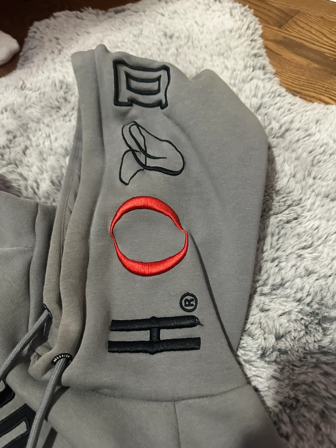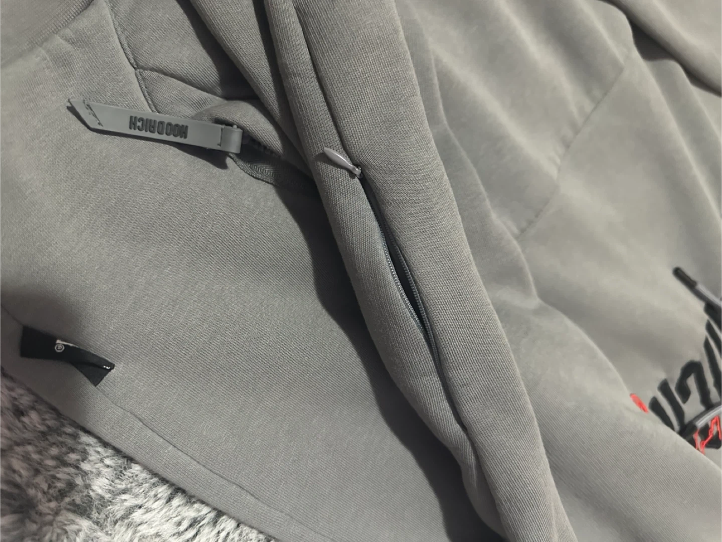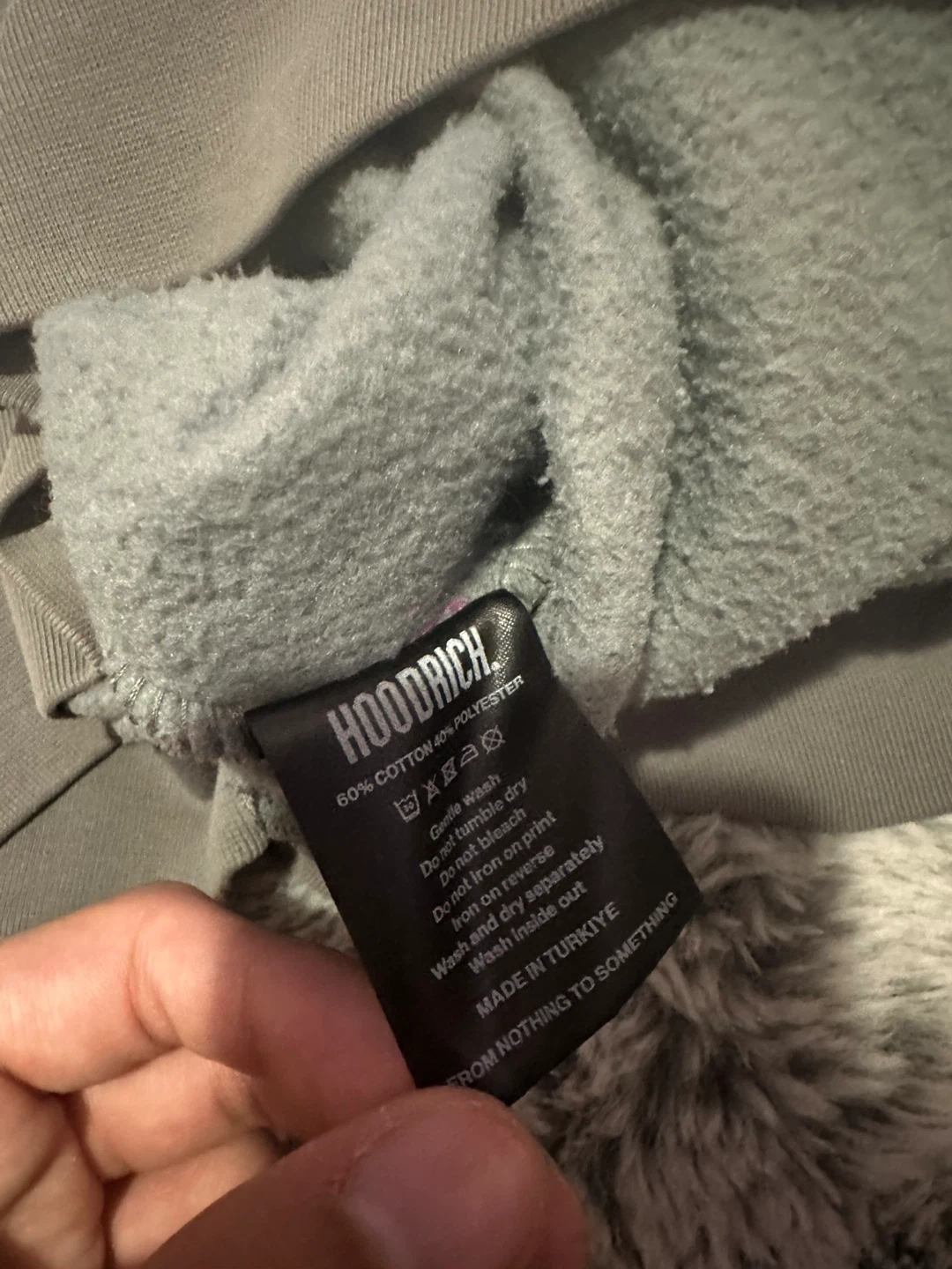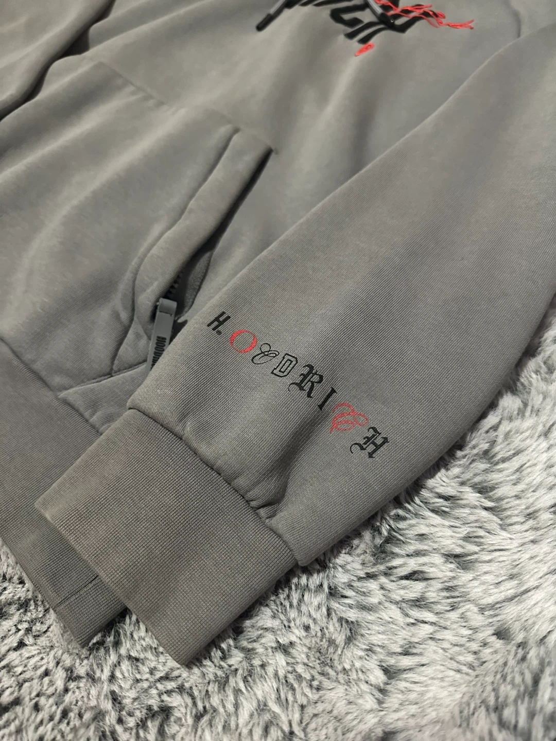 Selling a Hoodrich hoodie in size large. It's a stylish grey colour with the brand name embroidered on the front and sleeve. In good condition and ready for a new home!