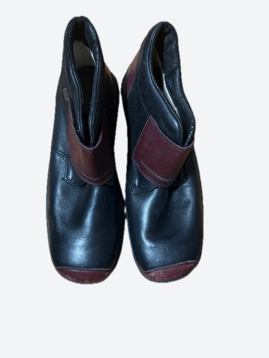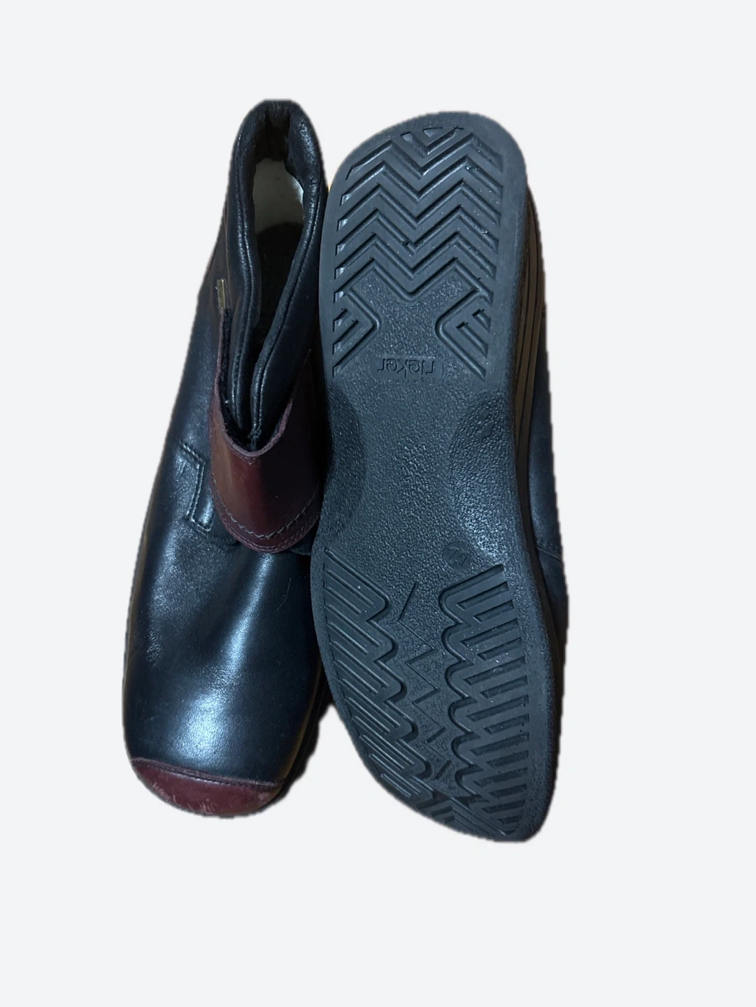 Comfortable black leather ankle boots with a dark red accent strap. These boots are made by Rieker. They have a durable sole with good tread.