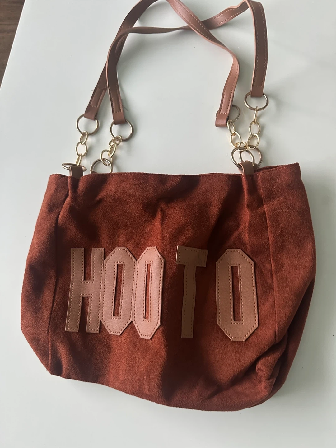 This is a brown suede HOOTO shoulder bag. It features gold-tone hardware and a spacious interior. The bag is in good condition and ready for a new home!