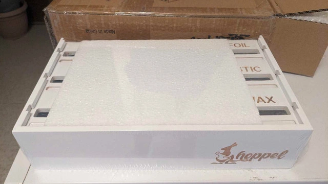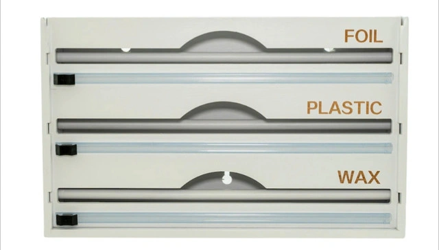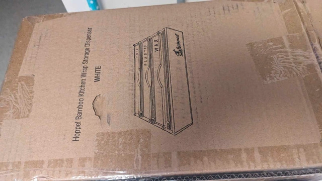 Keep your kitchen tidy with this Hoppel bamboo kitchen wrap storage dispenser! Designed to hold foil, plastic wrap, and wax paper, this organizer can be wall-mounted for convenience. It's in new condition, still in its original packaging. No more messy drawers – this dispenser will keep everything neat and accessible! Additional details: * Material: Bamboo * Compartments: Three (foil, plastic wrap, wax paper) * Mounting: Wall-mountable * Colour: White