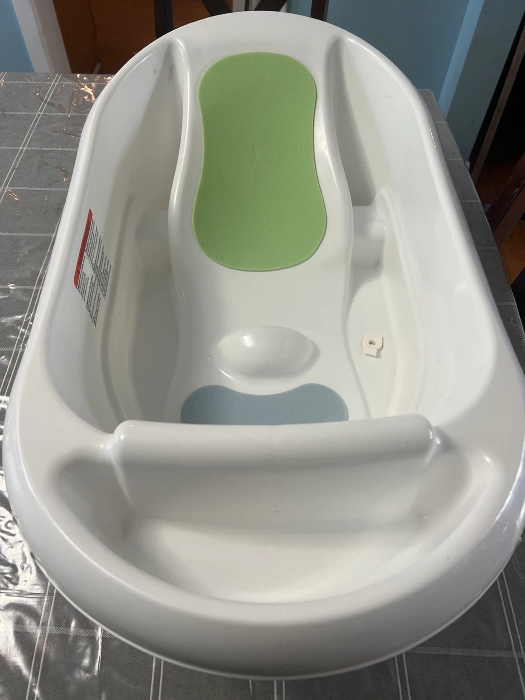 66Selling a Hopscotch baby bathtub! It's in great condition and perfect for your little one's bath time. It has a built-in seat with a soft green backrest and a blue support in the middle, making bath time safer and more comfortable Check my other adds for more bay stuff make an offer for what you need