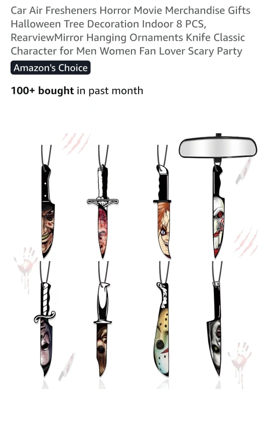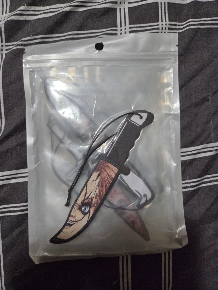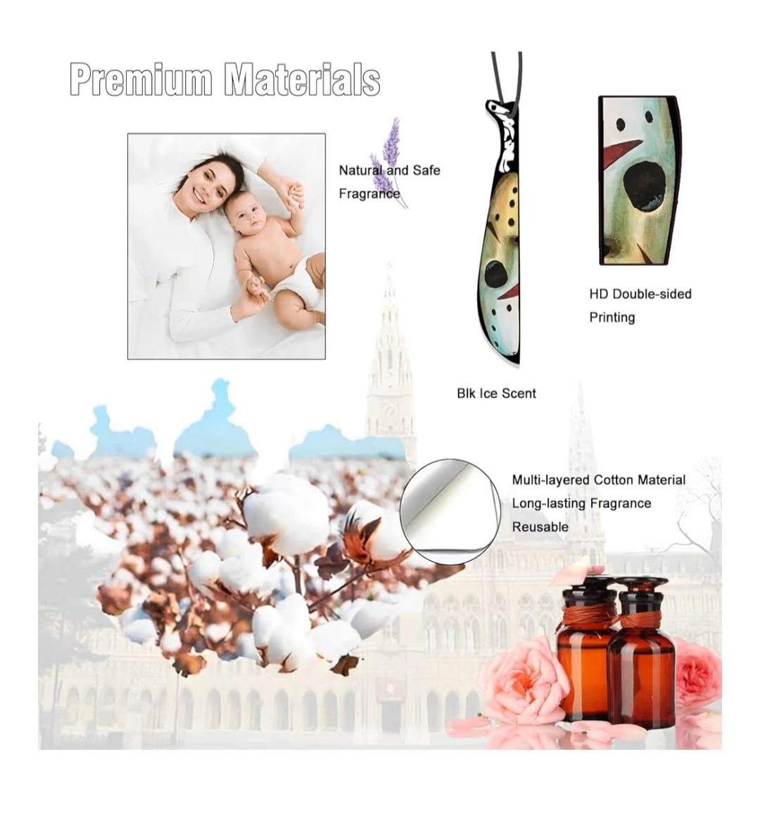 Get ready to add some spooky flair to your ride with these horror movie character car air fresheners! This set includes 8 pieces, each featuring a classic horror movie character. They're double-sided printed and made with multi-layered cotton material, plus they have a long-lasting 'Blk Ice' scent. Perfect for Halloween or any time you want to show off your love for scary movies. Sealed, brand new and never used or open.