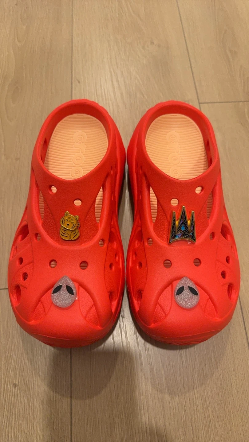 Bright red Crocs with fun Jibbitz! They're in great shape and ready for a new home. Perfect for adding a pop of colour to any outfit or just for comfy everyday wear