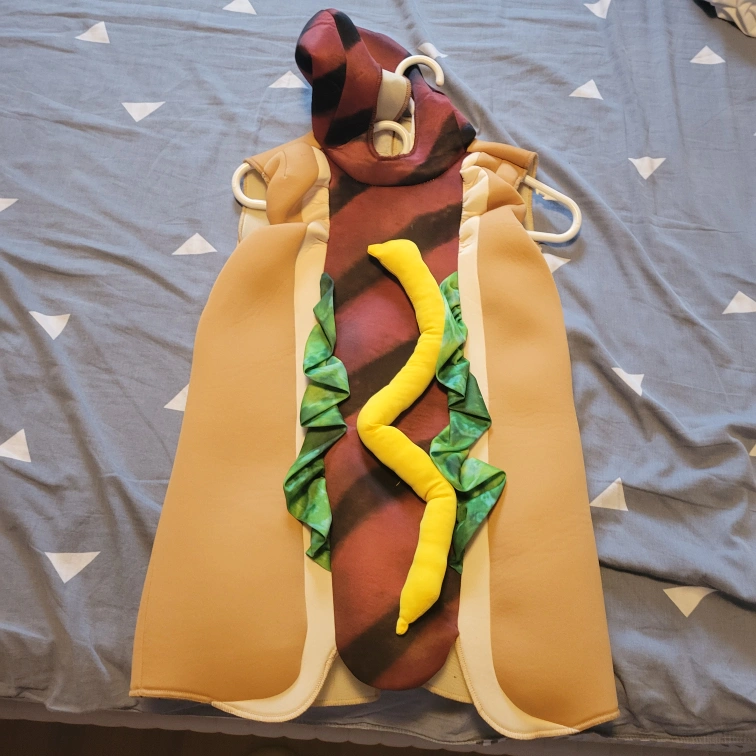 35Hot dog costume. Includes a hot dog, bun, and mustard.