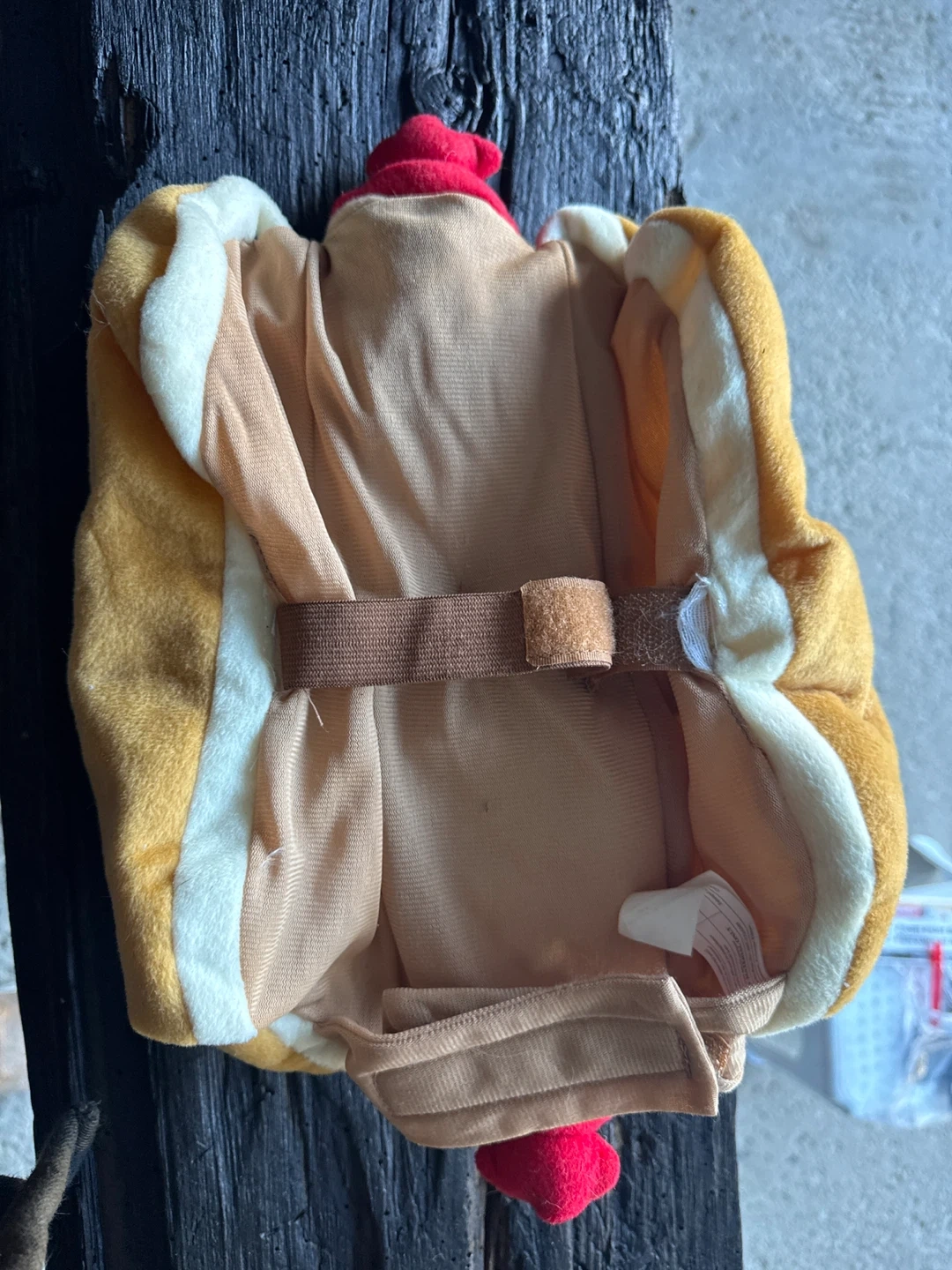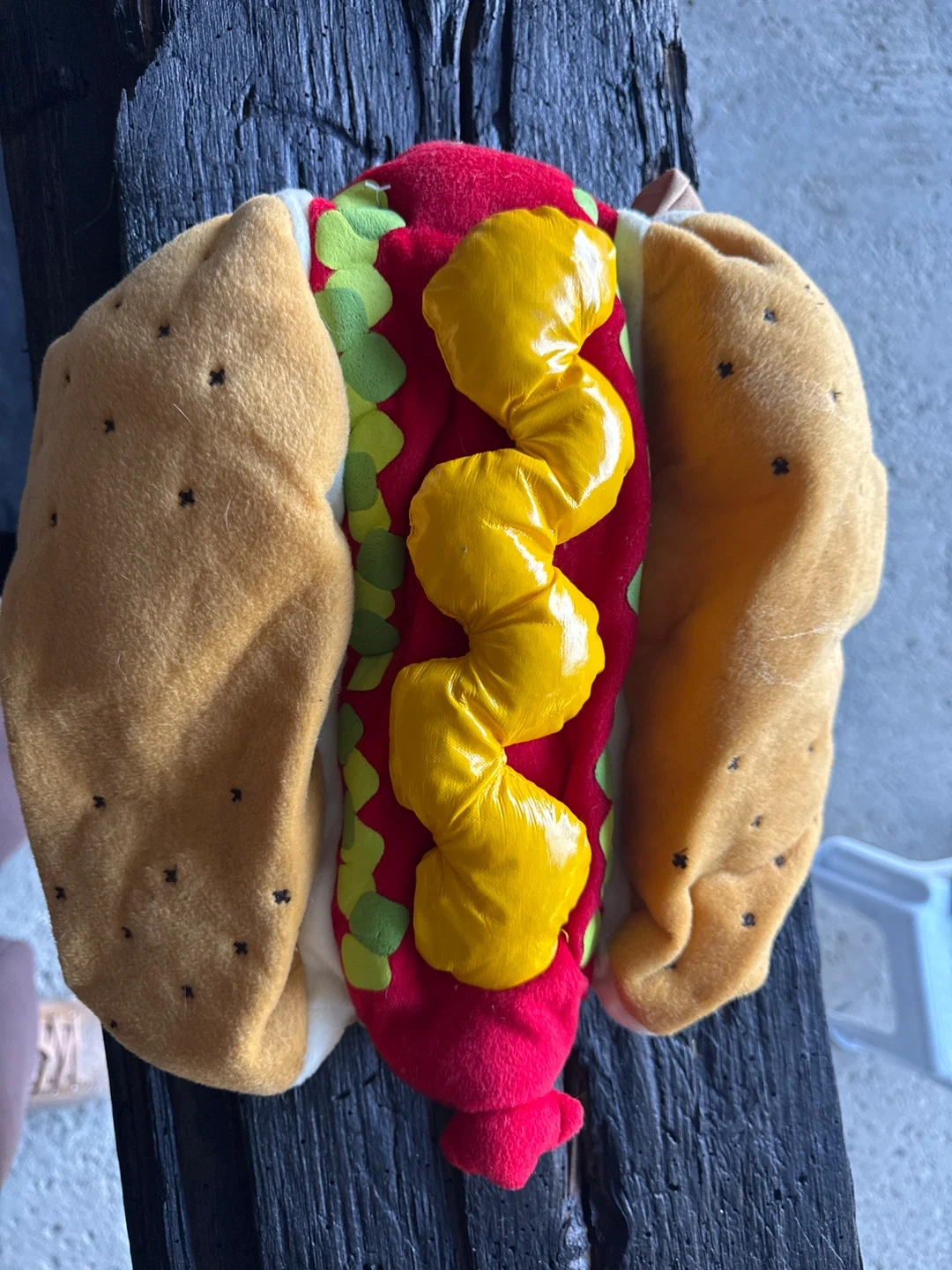 This is a cute hot dog costume for your pet! It has the bun, lettuce, ketchup, and mustard. It's in great condition and ready for a new home! Your pet will be the talk of the town!