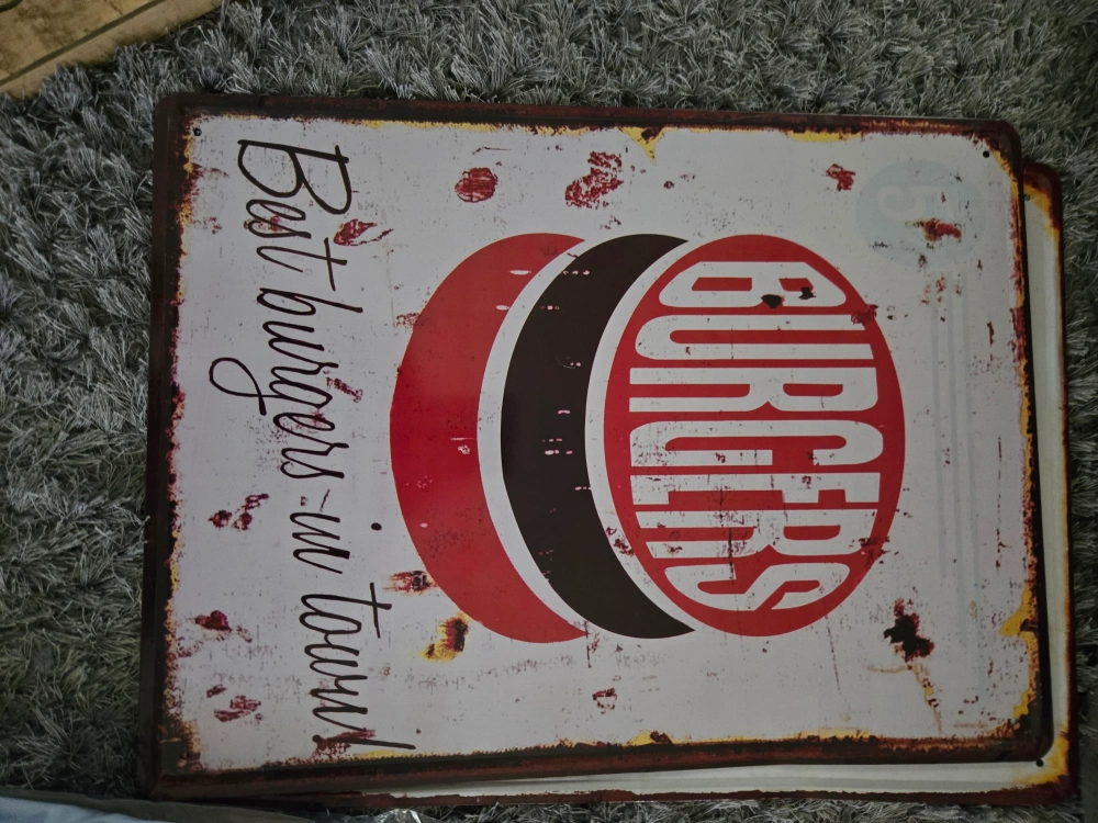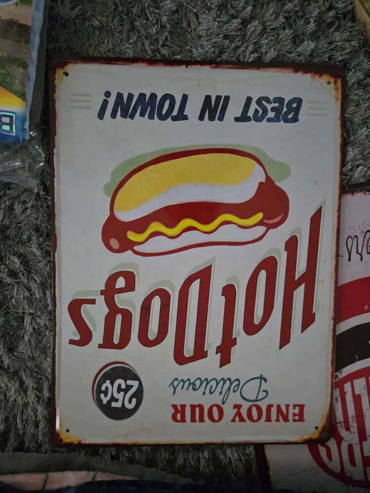 I'm selling two metal signs, one with a hot dog design and the other with a burger design. They're perfect for adding a retro touch to your kitchen or dining area. The signs are in good condition and ready to hang!
