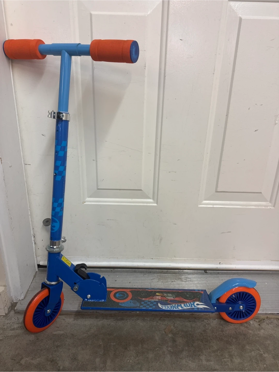 10Blue and orange scooter in good condition and ready for a new home. Folds up easily and has adjustable handle bar, perfect for kiddos 3-7. Very gently used, does have a few tiny scuffs on handle bar and discolouration on wheels from pavement but otherwise in like new condition.