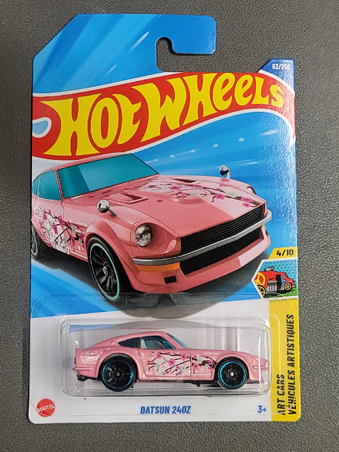 39Selling a Hot Wheels Datsun 240Z. It's pink with a cherry blossom design. Great for collectors or kids aged 3+