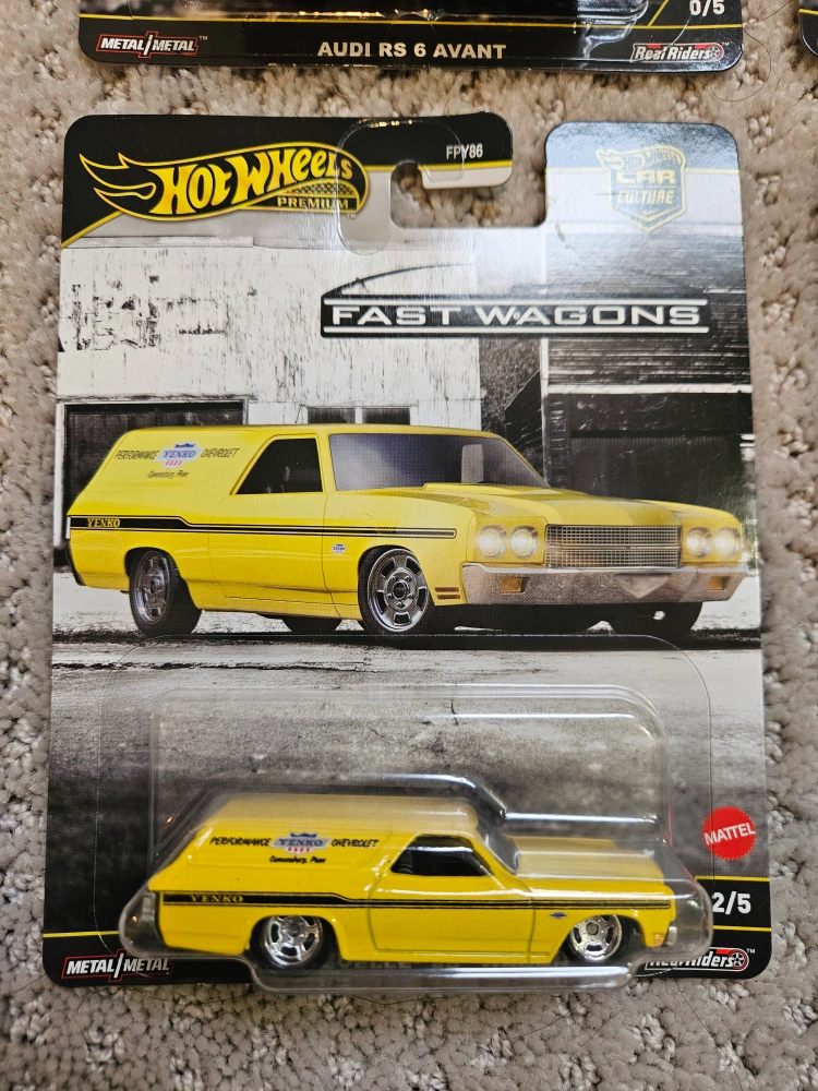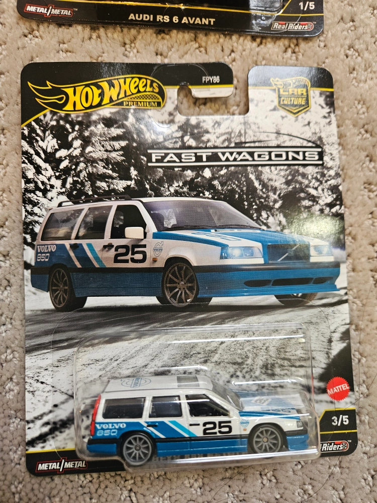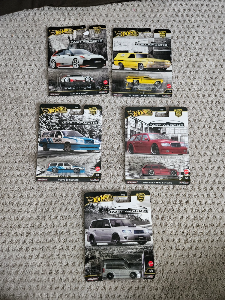 Selling a set of Hot Wheels Premium Car Culture Fast Wagons! Includes: - Audi RS 6 Avant (1/5) - '70 Chevelle SS Wagon (2/5) - Volvo 850 Estate (3/5) - Mercedes-Benz E 36 AMG (4/5) - Subaru Outback (5/5)