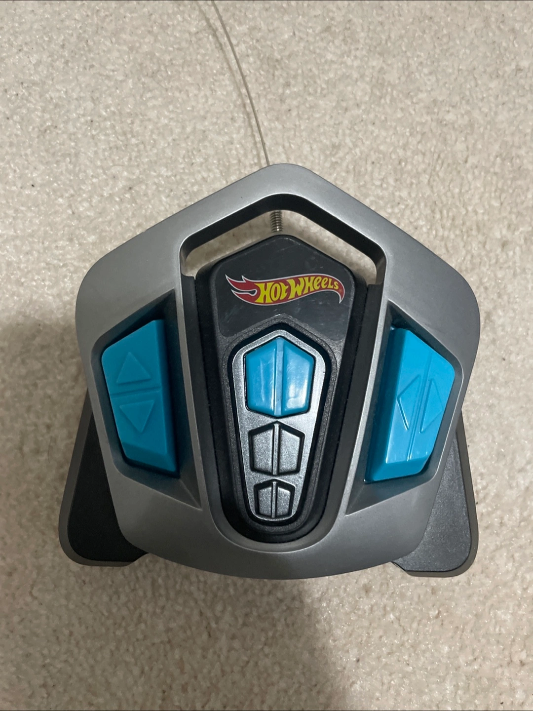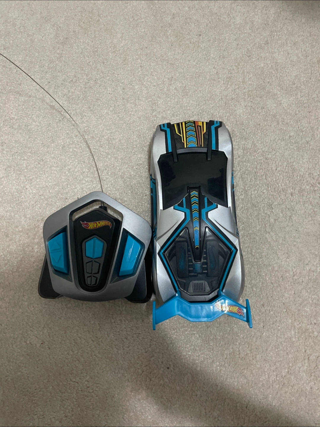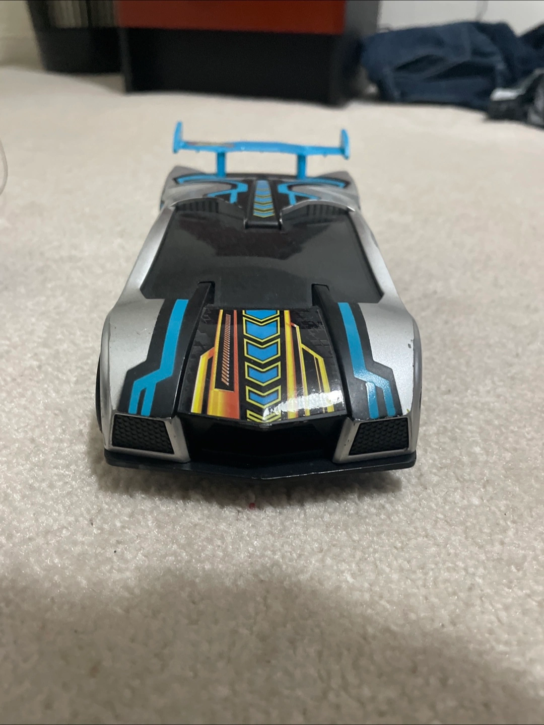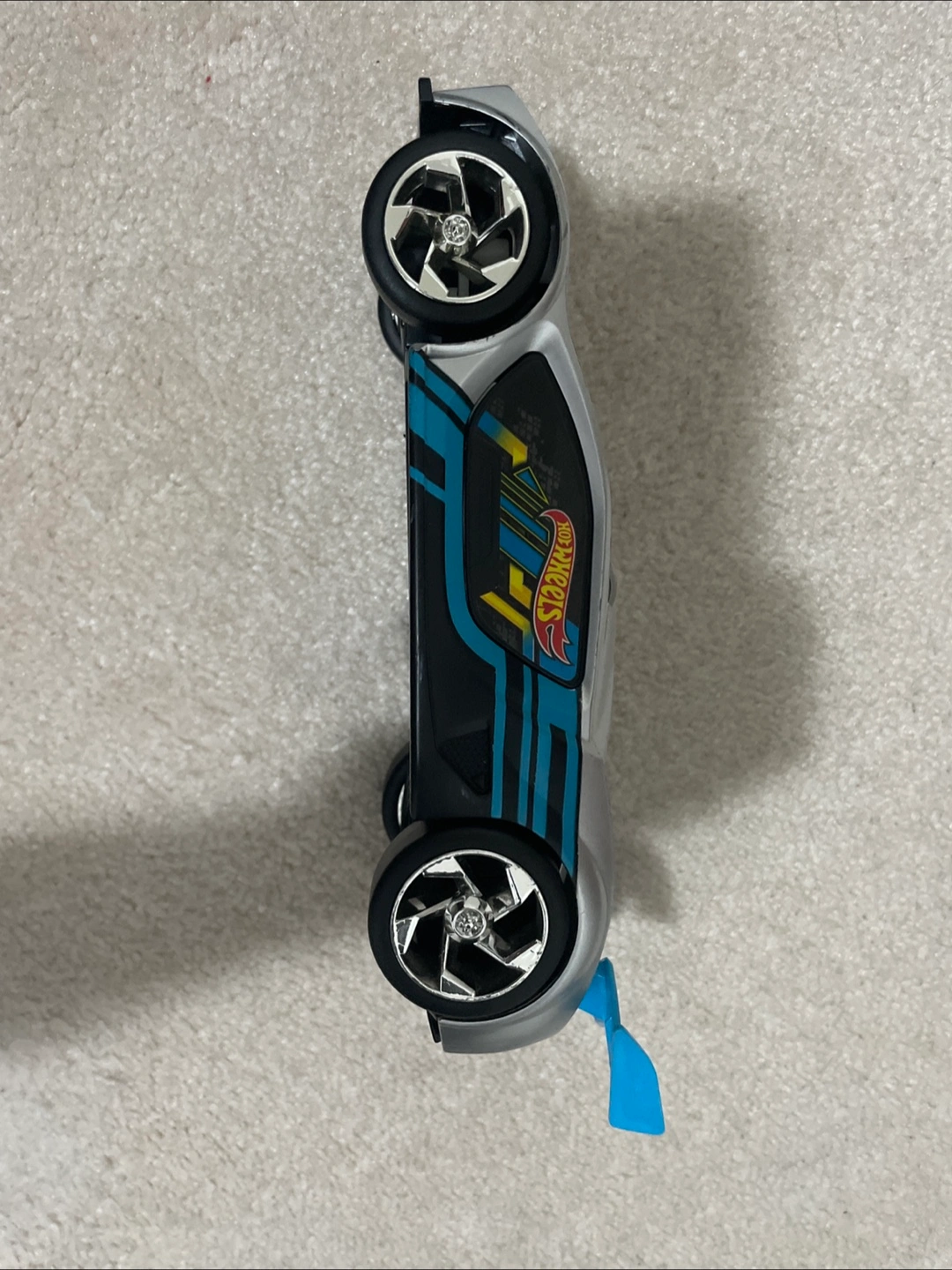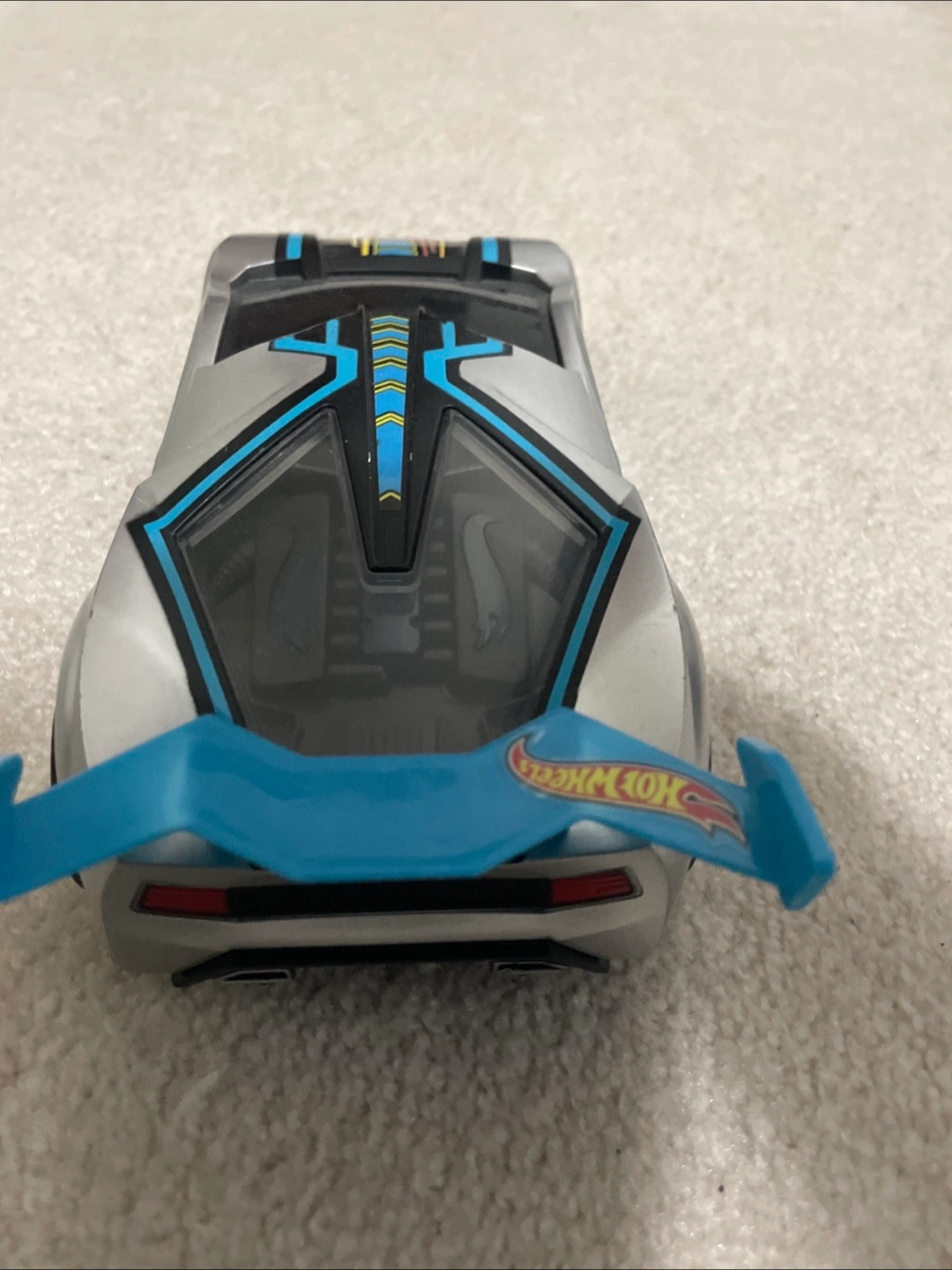 Silver and blue RC car. Comes with a remote control. Features a spoiler and detailed car design. Great for entertaining yourself on a rainy day. Fun drift car