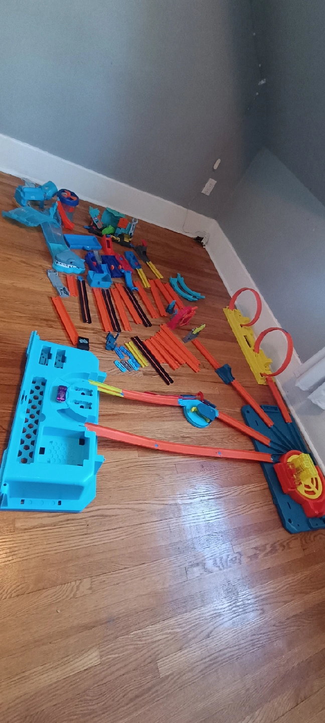 Selling a Hot Wheels Track Builder set! It's the Unlimited Rapid Launch Builder Box. This set is great for kids aged 6-12. It comes with lots of extra track pieces and accessories for building awesome race setups. Originally bought for $236.56 CAD + around 50 in other accessories
