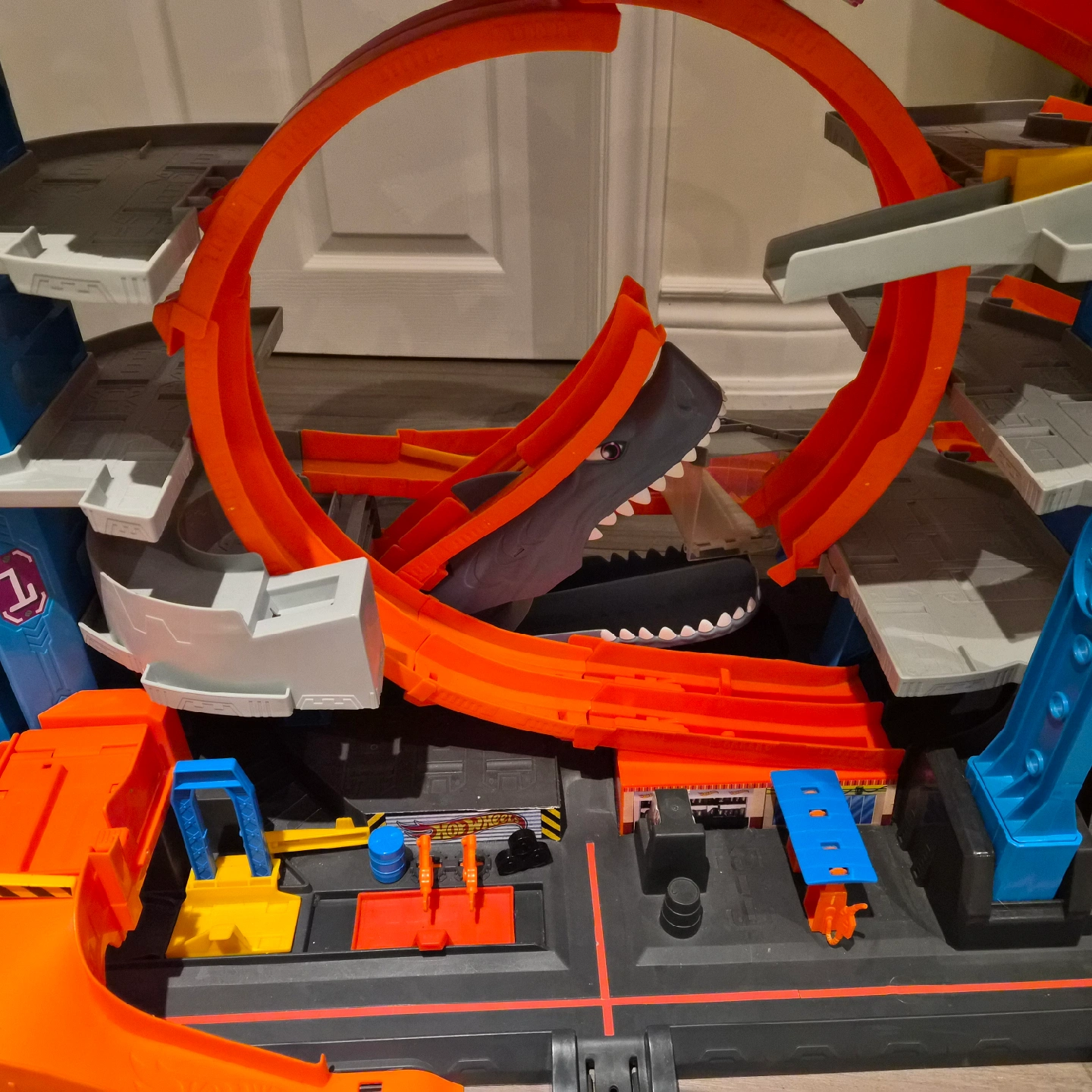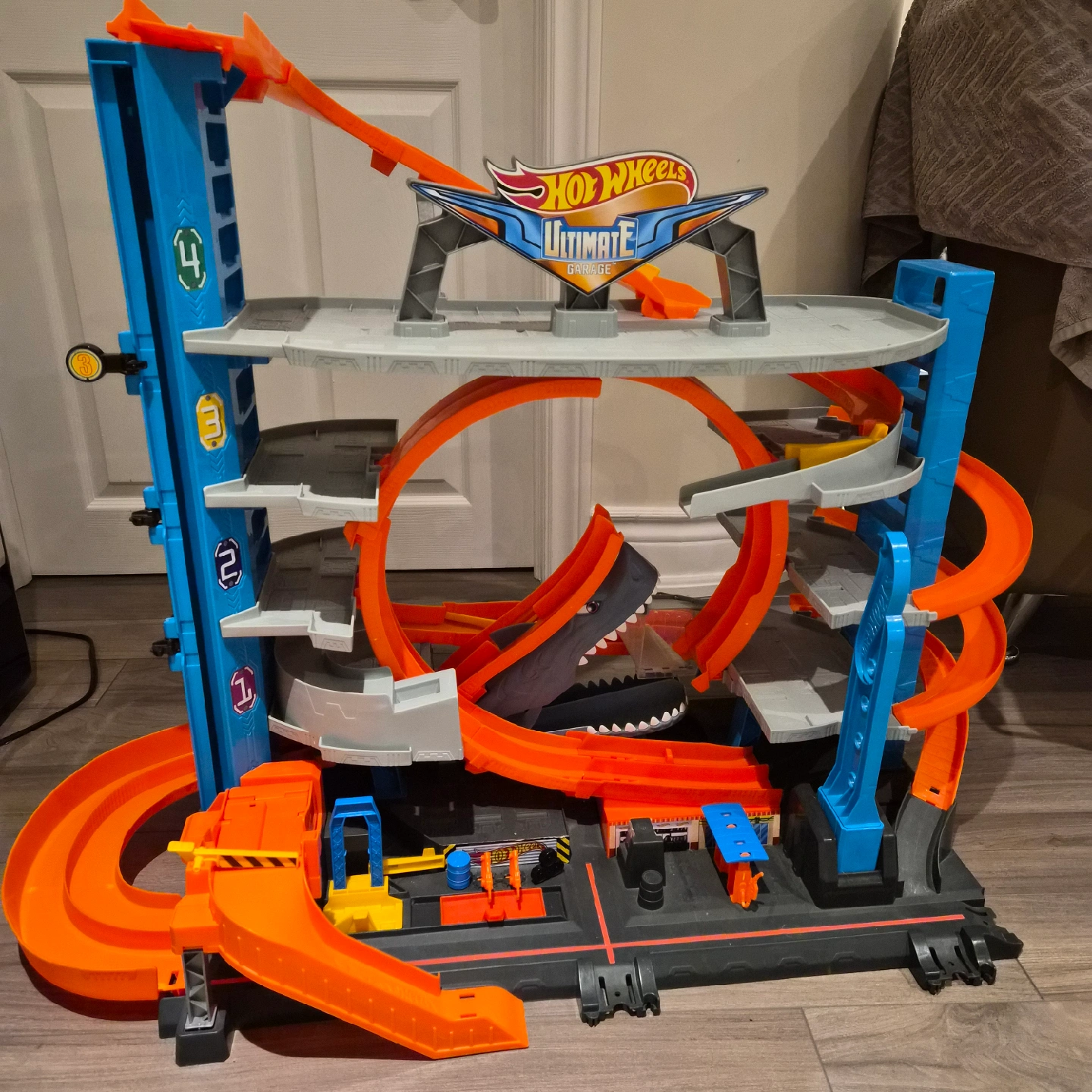 Selling a Hot Wheels Ultimate Garage playset! It's in great shape and ready for a new home. This set is packed with features for hours of fun, including a shark that chomps cars and parking spots for hot wheel cars!