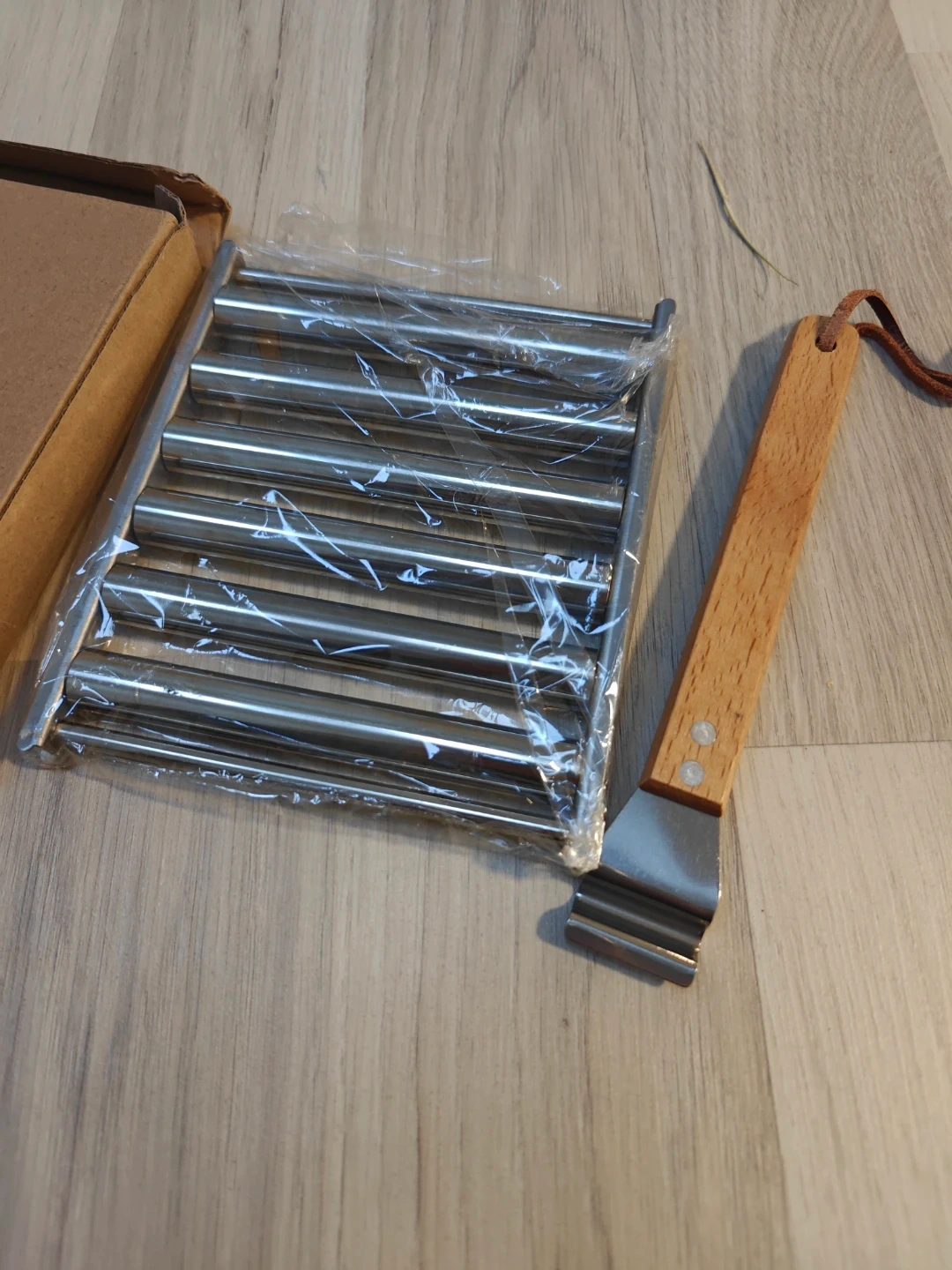 158Selling a stainless steel grill grate hotdog roller. It comes with a wooden handle and is still in its original packaging!