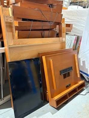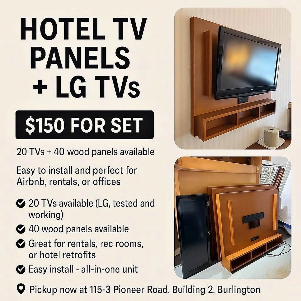 From an upscale hotel liquidation: Solid wood TV wall panels with shelving, outlets & LG flat-screen TVs – sleek, durable, and rental-ready. Each panel includes: ✔ Built-in wall mount bracket ✔ Dual power outlet ✔ Cable cutout + 3 open cubbies ✔ Matching LG TV (tested & working) 🔹 20 complete sets available (TV + panel) 🔹 40 panels total 🔹 Great for rentals, rec rooms, Airbnbs, or office setups 🔹 Easy to mount – plug and play 💰 $150 – Set (Panel + TV) 💰 $100 – Panel only 💰 $50 – TV only 📦 Bulk pricing for 5+ units 👉 Part of our full hotel liquidation – wardrobes, vanities, mirrors, linens & more.