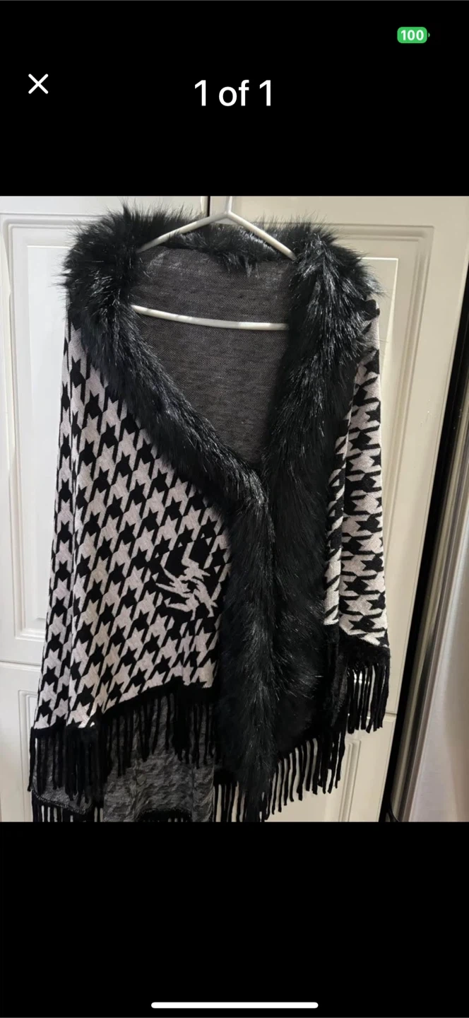 Stylish houndstooth poncho with a cozy faux fur trim! This poncho features a classic black and white houndstooth pattern, accented by soft black faux fur around the collar and edges. It's just what’s needed for adding a touch of elegance to any outfit. The fringe detailing adds a fun, fashionable flair. The material is soft and cozy and perfect for a cold fall or spring night. In brand new condition. One size fits all. Serious buyers only.