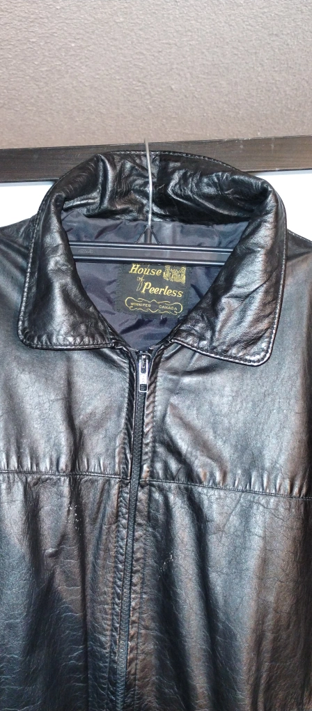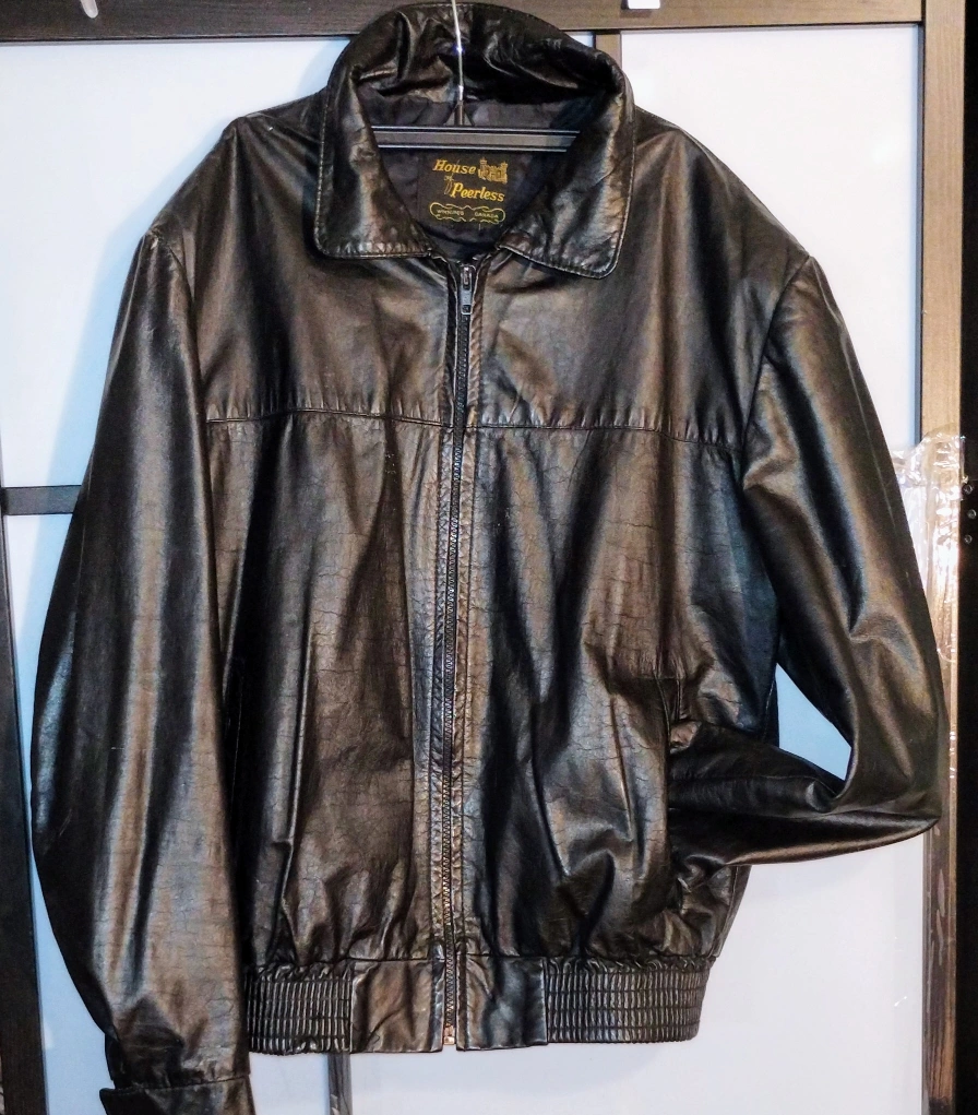 15Black leather jacket with a zipper closure and elastic waistband. Unisex fashion.