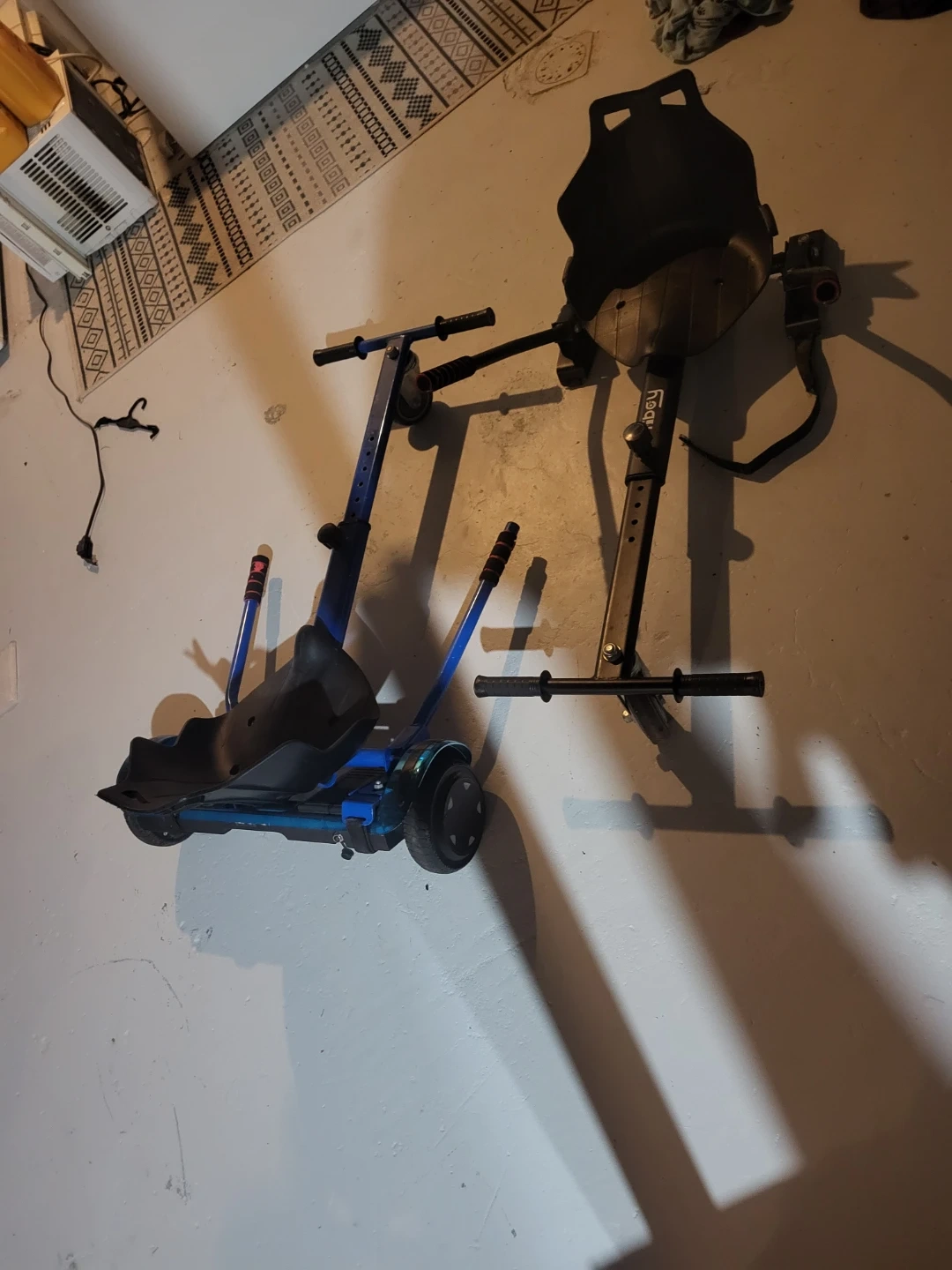 21Here are two hoaverboards! They still work great! Both come with a charger, i also have two attachments that allow ypu to drive it like a mini go cart! There great but my kids dont use them anymore and they are just collecting dust! Asking 350$ for all 4 items together or... 150 $ for each hoverboard 75$ each for attachment This is perfect gift for your teen, niece, nephew or even yourself! Holds up to 200lbs Or best offer!