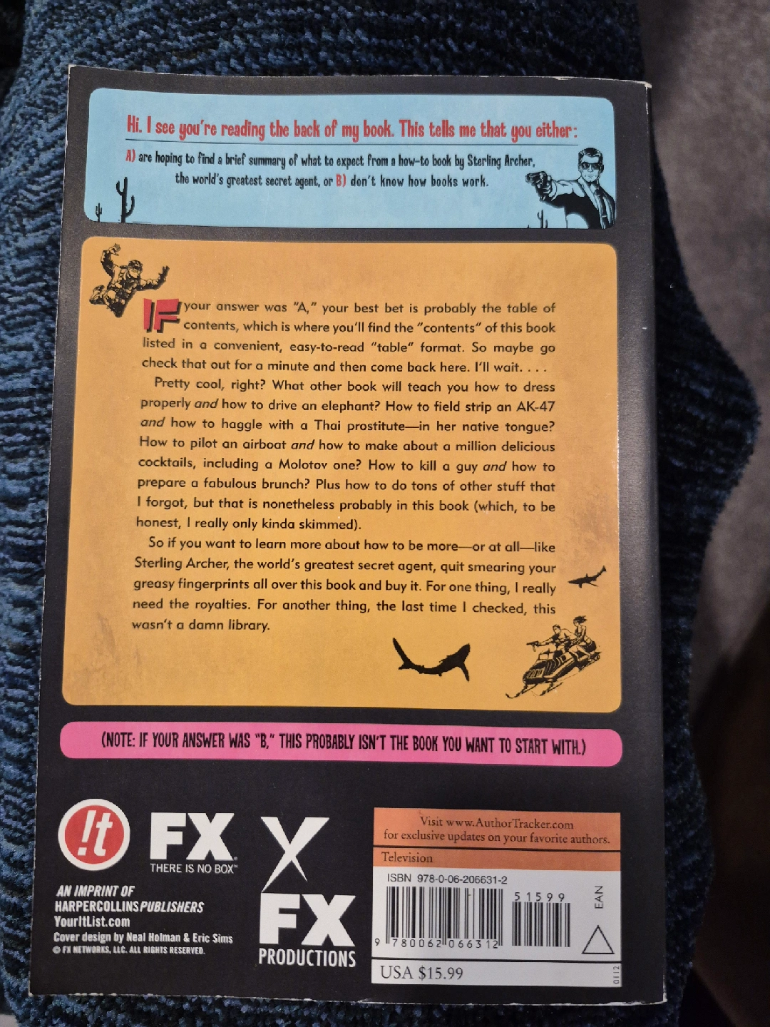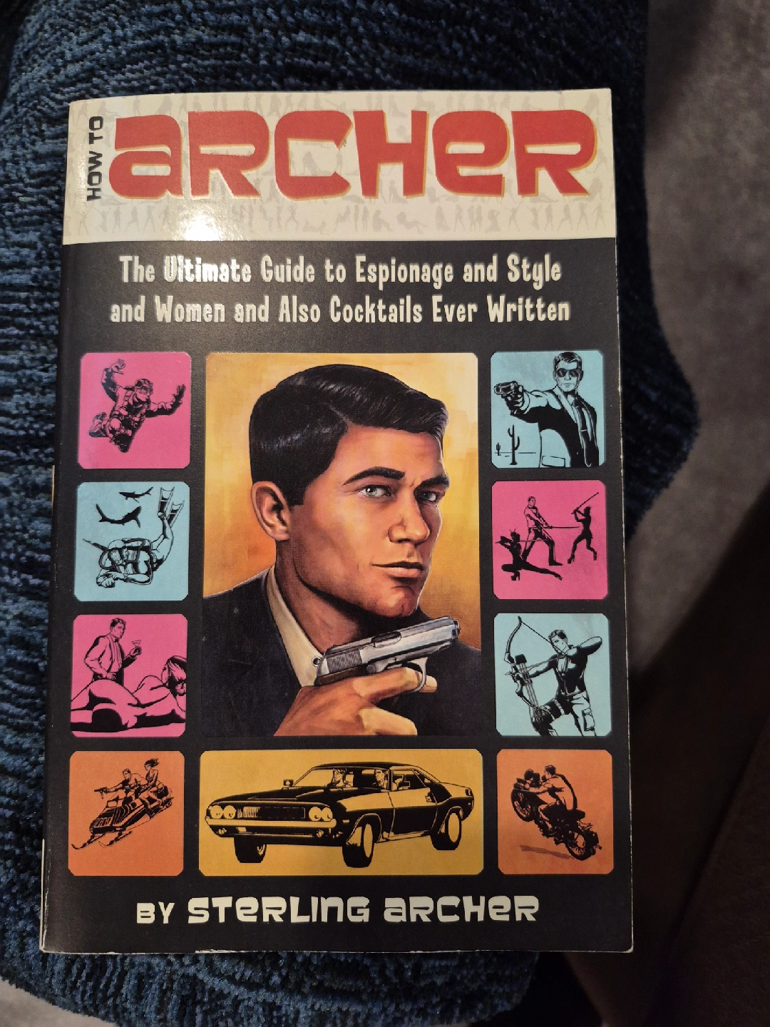 Selling a copy of "How to Archer: The Ultimate Guide to Espionage and Style and Women and Also Cocktails Ever Written" by Sterling Archer. It's a fun read!