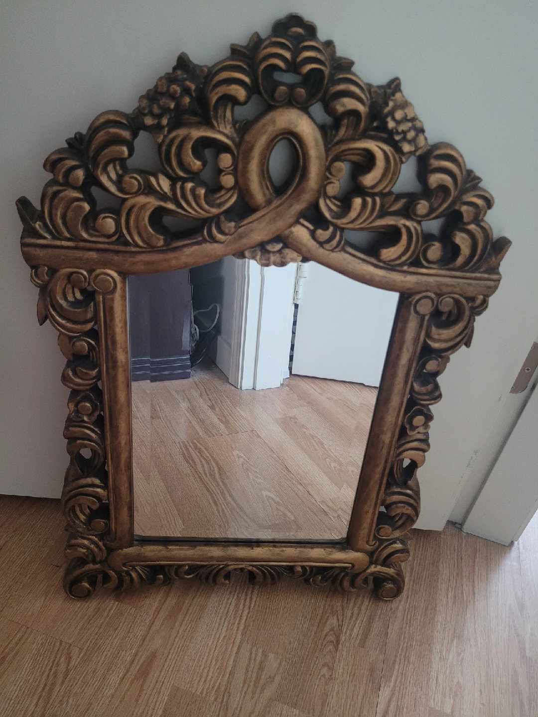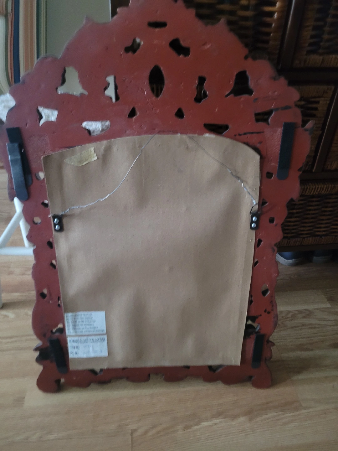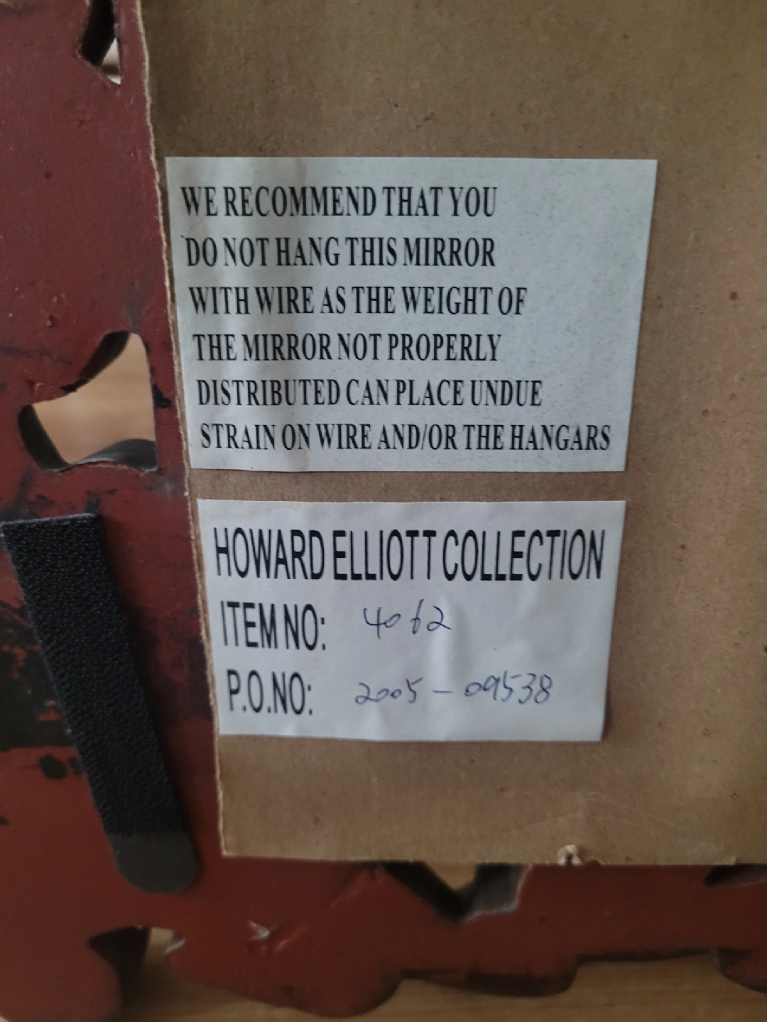 Selling a mirror from the Howard Elliott Collection. Please note the recommendation not to hang this mirror with wire, as the weight distribution can place undue strain on the wire and/or the hangers. It's about 19 by 28 inches.