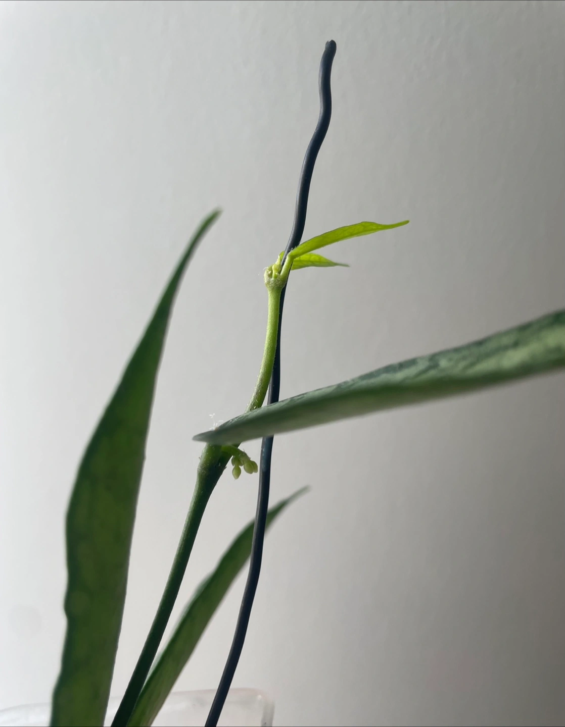 Selling a lovely hoya pandurata with splashy variegation! It's currently potted in a clear plastic container with soil and pon mixture. The leaves have a beautiful green and silver pattern. It has new growth!
