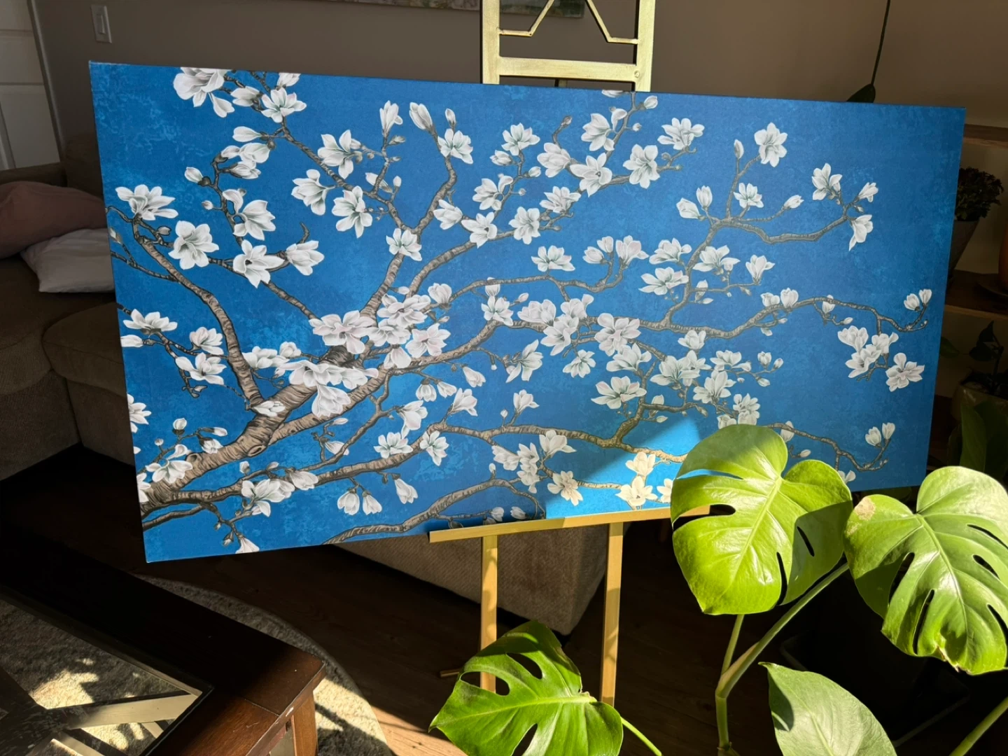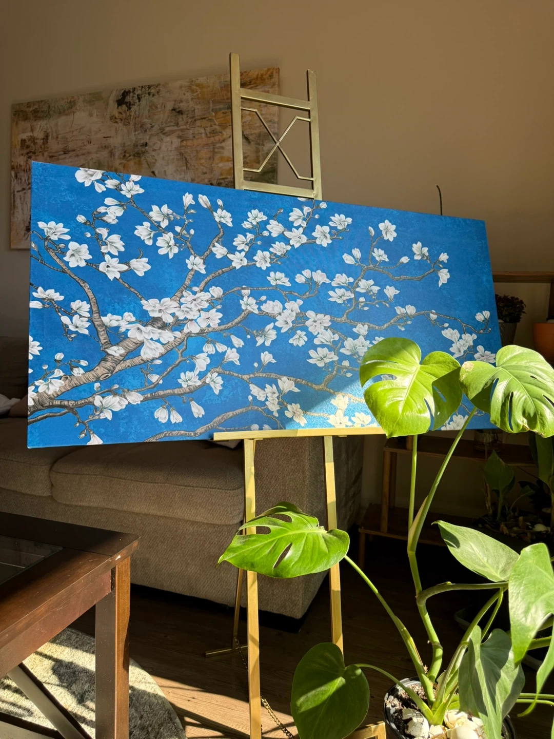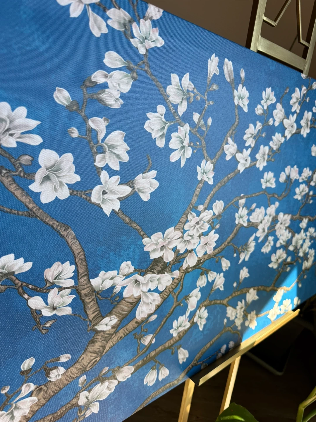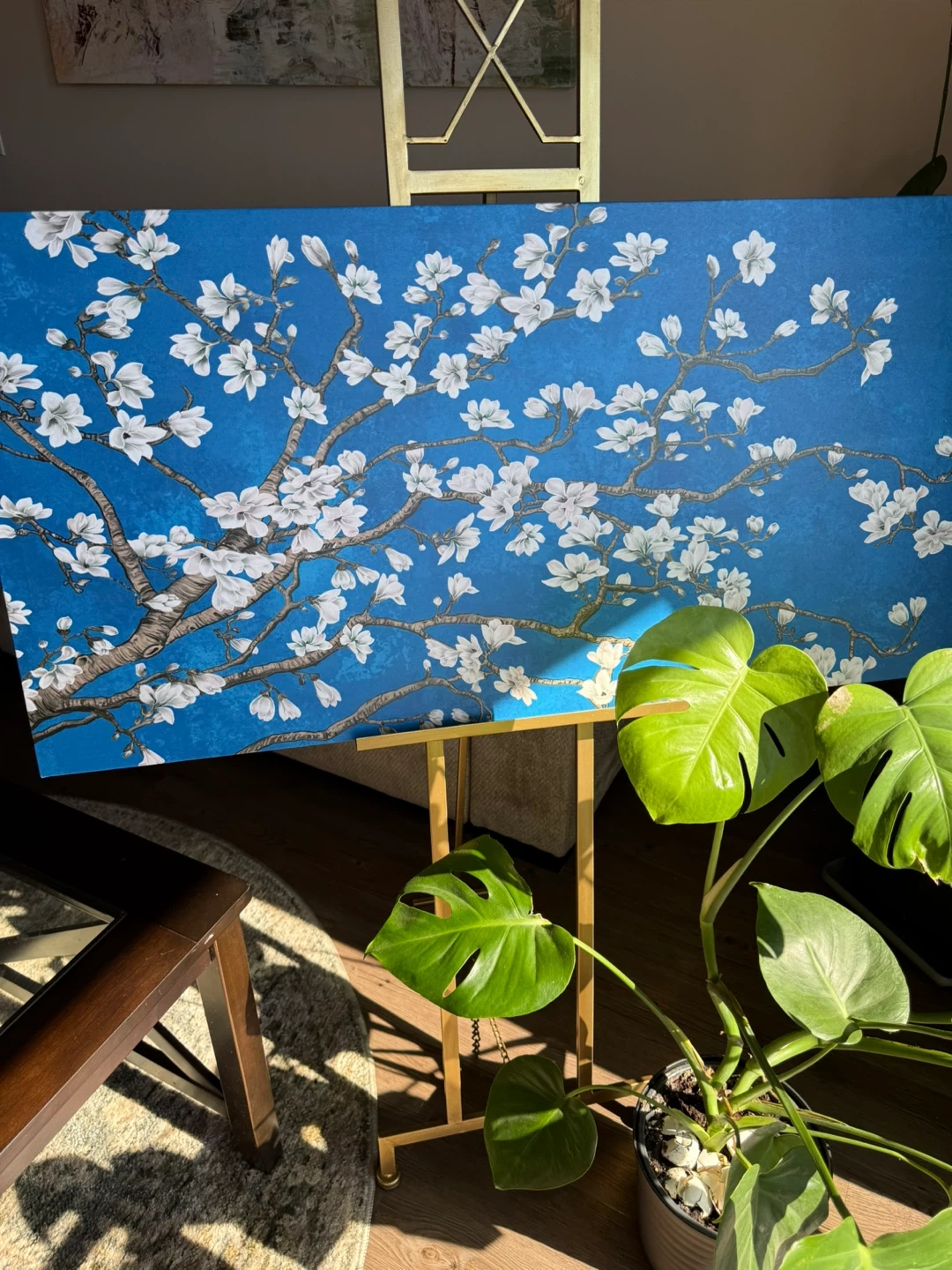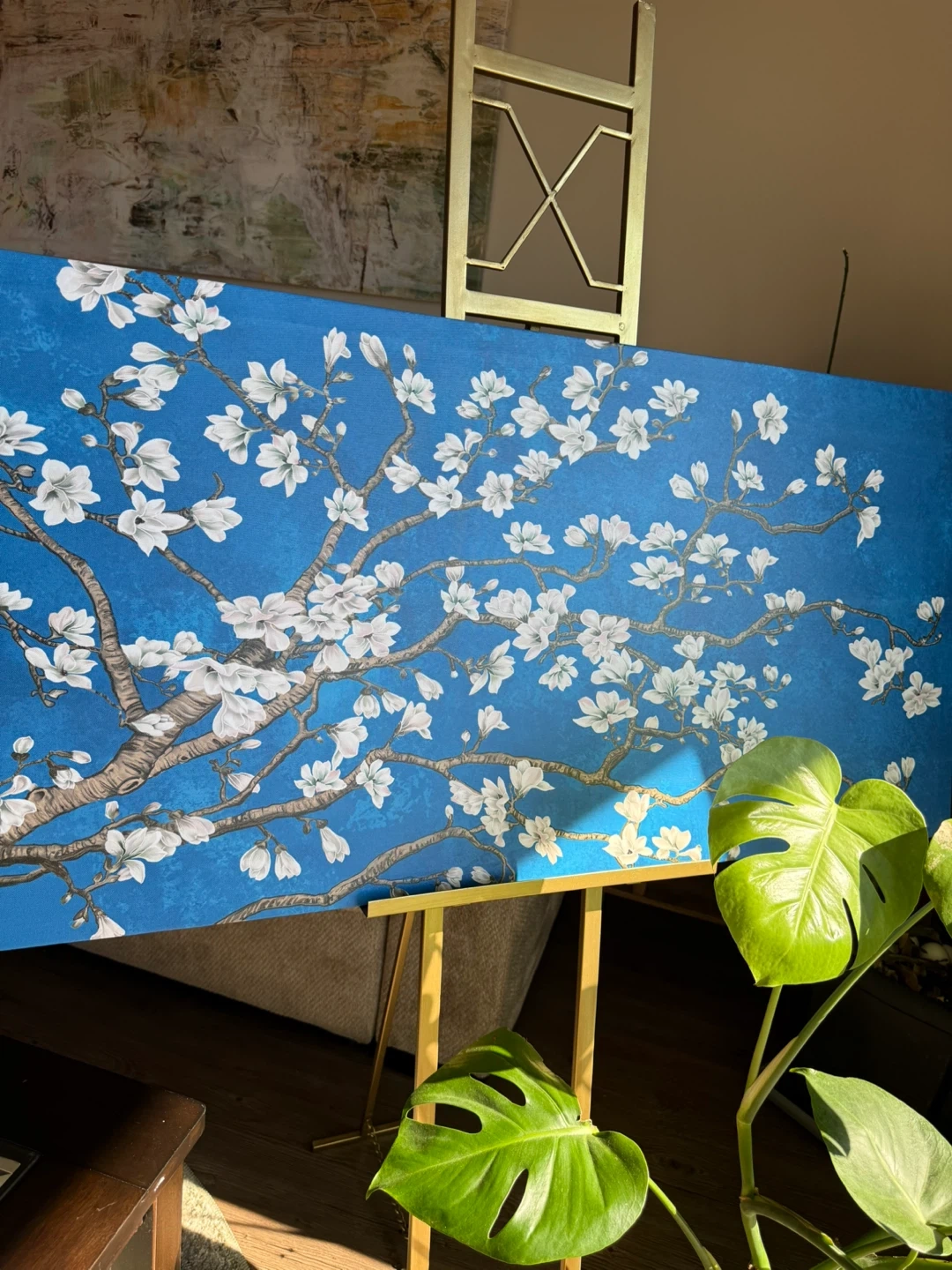 A beautiful floral tree painting on a vibrant blue canvas! This piece would be a lovely addition to any room, adding a touch of nature and elegance to your space. The canvas is in great condition and ready to be displayed