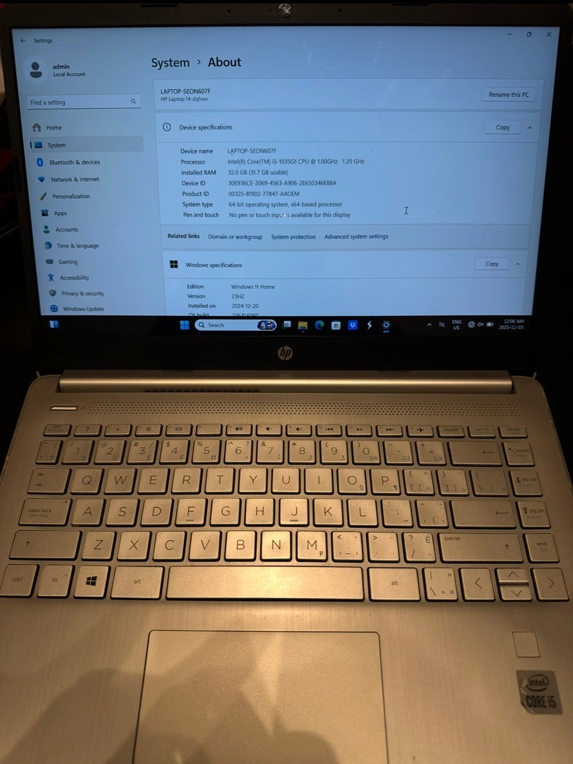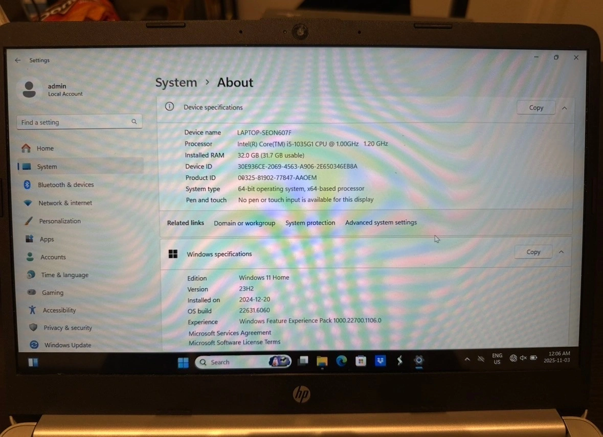 86HP 14S-DQ1XXX | Intel Core i5-1035G1 | 32GB RAM | 512GB SSD | 14" Display Reliable and fast laptop in great condition. Perfect for work, school, or everyday use. Specs: * Intel Core i5-1035G1 (10th Gen) * 32GB RAM * 512GB SSD * 14” HD Display * Windows 11 installed * Excellent Battery life Clean, fully functional, and ready to use.