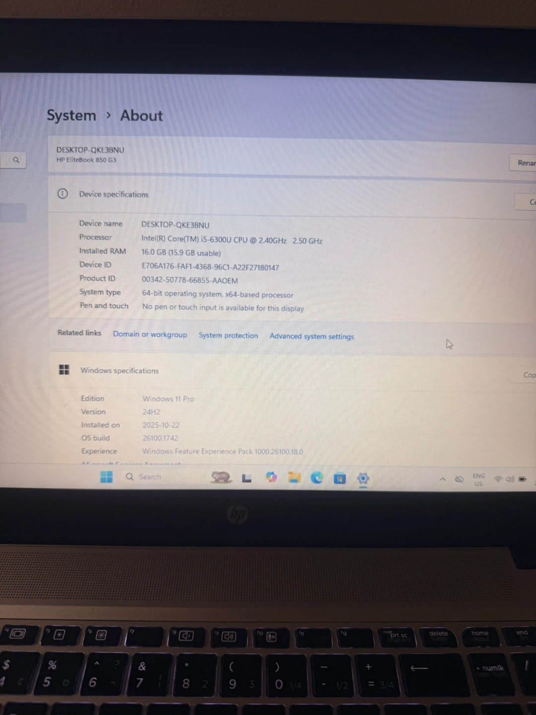 73🔥 FOR SALE: HP EliteBook 850 G3 - Powerful Business Laptop! 🔥 This HP EliteBook 850 G3 is a reliable and fast laptop, perfect for professionals, students, or anyone needing a high-performance machine for work, school, or daily tasks. Featuring a durable, sleek silver design and excellent performance specs. 💻 Key Specifications (Based on System Info): • Model: HP EliteBook 850 G3 • Processor: Intel(R) Core(TM) i5-6300U CPU @ 2.40 GHz (Max Turbo up to 3.0 GHz) • The 6th Gen i5 processor offers efficient performance for multitasking and all general office/web-based tasks. • Memory (RAM): 16.0 GB DDR4 (15.9 GB usable) • Plenty of RAM for heavy multitasking, running multiple apps, and smooth performance. • Operating System: Windows 11 Pro (64-bit) - Updated to the latest 24H2 version! • System Type: 64-bit operating system, x64-based processor. • Display: 15.6-inch diagonal screen (Standard G3 models often feature Full HD 1920x1080 resolution). • Memory Speed: 2133 MHz • Memory Slots: 2 of 2 slots used (Maxed out RAM for this configuration). ✨ Features & Benefits: • Business-Grade Build: EliteBooks are known for their durable chassis and reliability. • ✅ Backlit Keyboard: Type comfortably in any lighting condition with the adjustable keyboard backlight—a must-have for working at night! • Windows 11 Pro: Ready to go with the professional version of Windows, offering advanced security and management features. • Excellent Connectivity: Typically includes USB 3.0, a charging USB port, USB Type-C, DisplayPort, VGA, and RJ-45 Ethernet. • Premium Audio: Audio by Bang & Olufsen (Common feature on this model for excellent sound). • Spill-Resistant Keyboard (Adding an extra layer of durability). 📸 Condition: • Please see photos for the overall aesthetic condition. The laptop is clean and in great working order. • The system is fully functional and has been wiped/freshly installed with the latest Windows 11 Pro. 🚀 Ready to Use! This laptop is perfect for demanding users looking for a stable and speedy workhorse. Just power it on and start working!