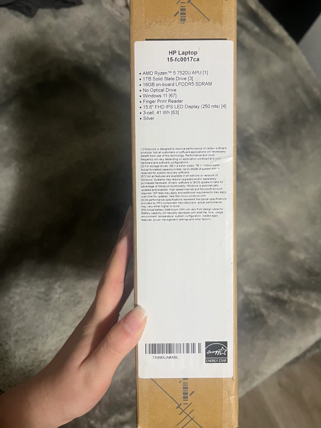 111Selling a 15.6 inch silver HP laptop (HP 15-fc0017ca), AMD Ryzen 5 7520U, 16 GB RAM, 1TB SSD. It comes with the original box and charger. There are a two scratches on the top, as shown in the pictures. Otherwise, it's in great condition and runs fast, only used it for a year of school but it’s too big for me. Great for gaming games like Minecraft, Peak, The Sims. Also lots of storage. See picture for all spec details.