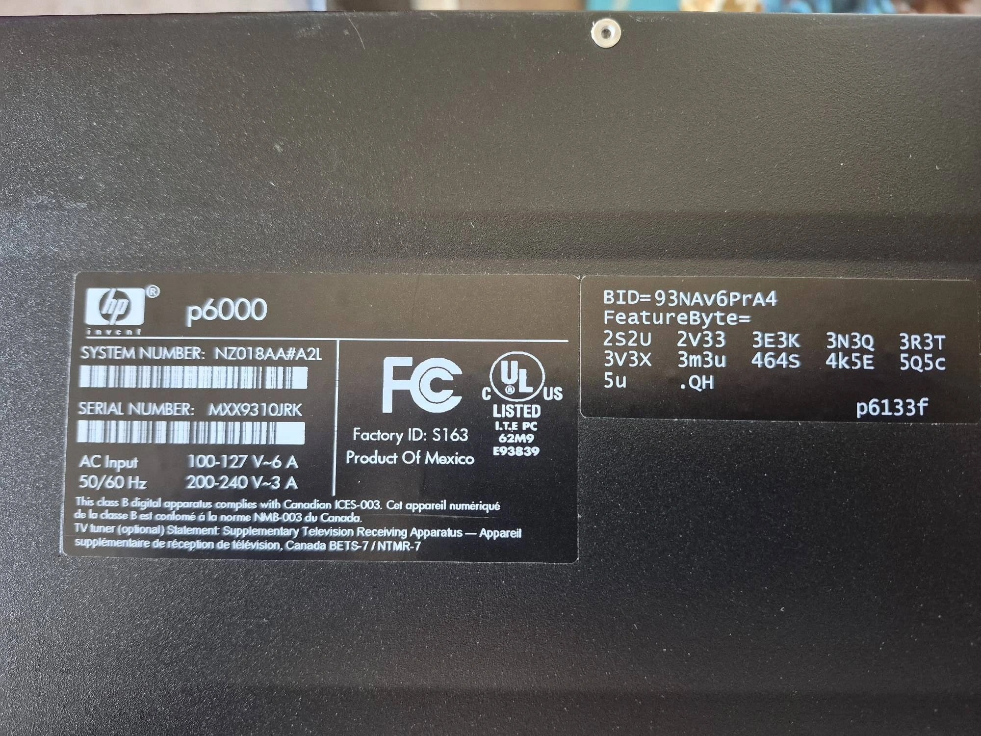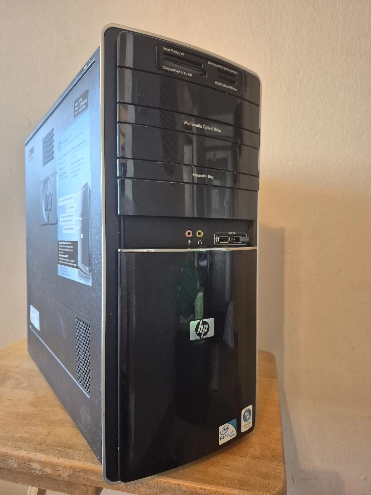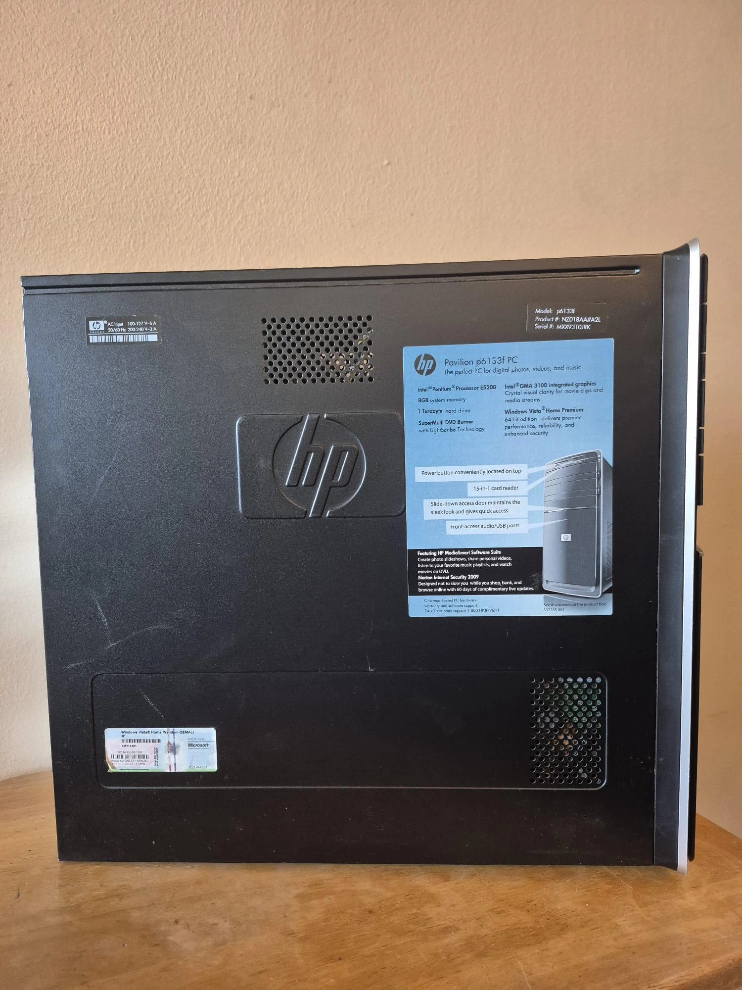 Selling an HP Pavillion p6133f PC. It's a desktop tower computer perfect for learning TrueNAS (ZFS) and netowork storage or simply for watching movies on DVD (but it will be slow) Key Features: HP Pavillion p6133f PC Product number: NZ018AA#A2L Intel Pentium(R) Dual-Core CPU E5200 @ 2.50GHz Builtin Operating System (Microsoft Windows 10 (64-bit) 8 GB (2GB 800MHZ x 4) 1 Terabyte hard drive SuperMulti DVD Burner with LightScribe Technology Intel(R) G33/G31 Express integrated graphics with Microsoft Corporation - WDDM 1.0 Expansion Slots:1 x PCI 32bit 2 x PCIe 2.0 x1 1 x PCIe 2.0 x16 Note: Monitor Not included. If you want the HP 2159m 21.5 inch Display also (Product # FV585AA) please contact