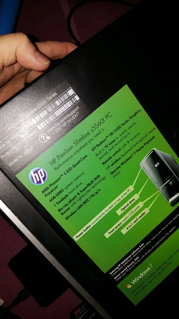 Selling an HP Pavilion Slimline s5560f PC. It features an AMD Phenom II 830 Quad-Core Processor, 6GB DDR3 system memory, and a 1 Terabyte hard drive. It also has a Blu-ray player & SuperMulti DVD Burner with LightScribe Technology and Wireless LAN 802.11b/g/n. It comes with Windows 10.