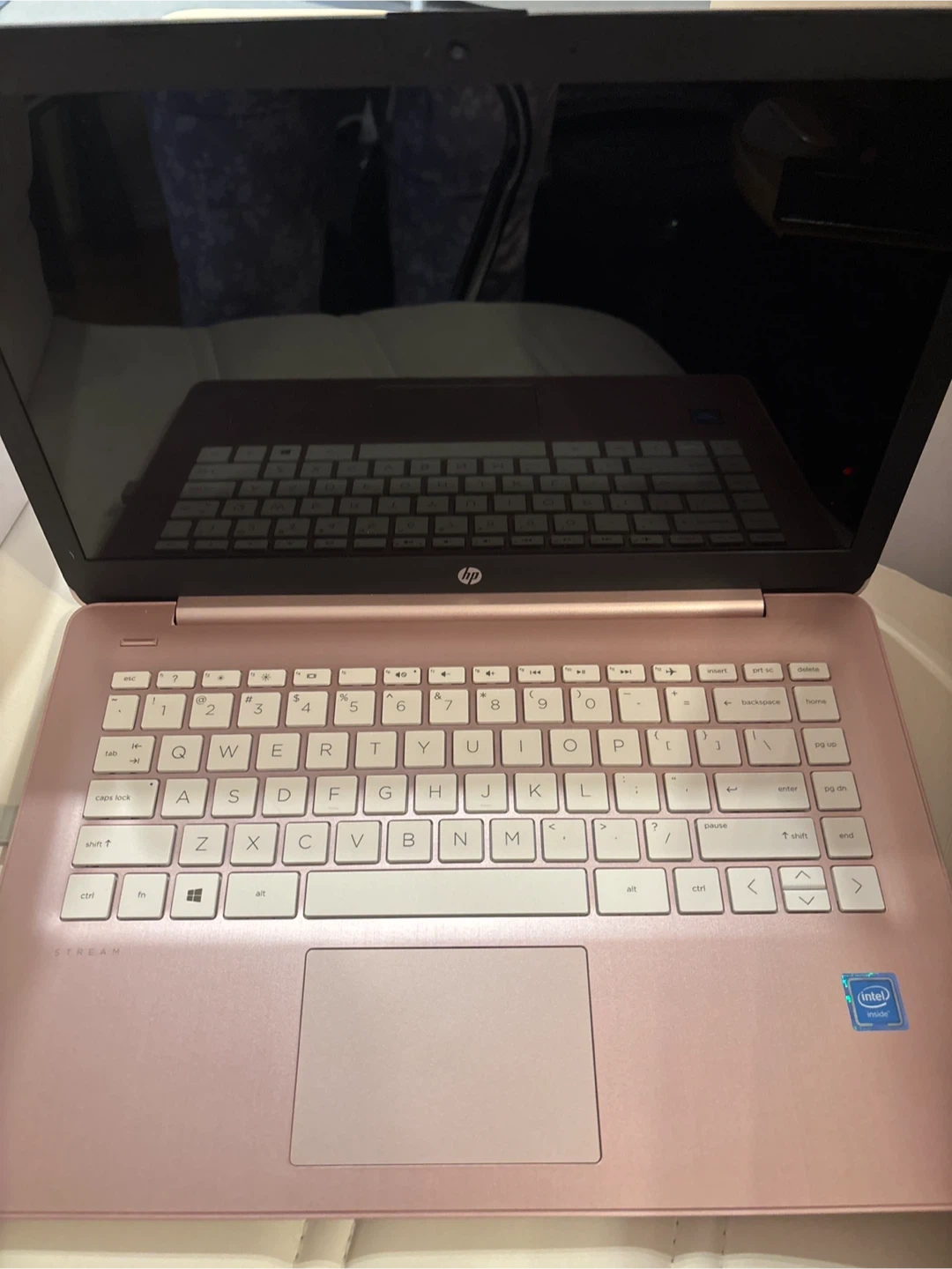 Selling a used HP Stream laptop in pink. It's in good condition and perfect for basic tasks like browsing and word processing. A great lightweight option for students or anyone on the go