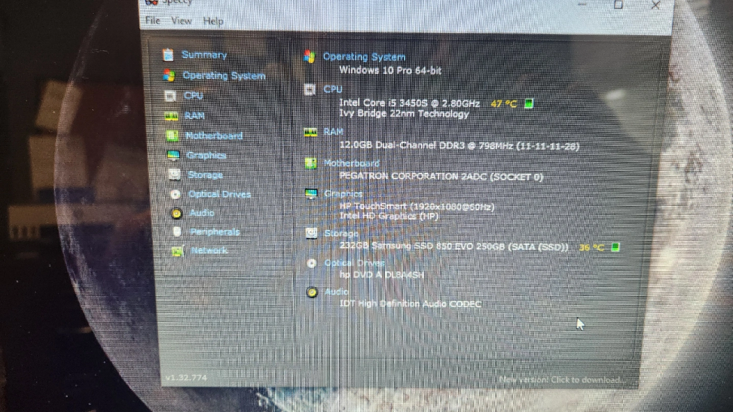 65Selling an HP TouchSmart 520 PC all-in-one desktop. It features Beats Audio for enhanced sound. 23 in touch screen for easy browsing. DVD player. Included Logitech Keyboard and Mouse Specs include: - Intel Core i5-3450S processor - Upgraded to 12GB RAM - Upgraded to 232GB SSD - Upgraded to Windows 10 Pro 64-bit