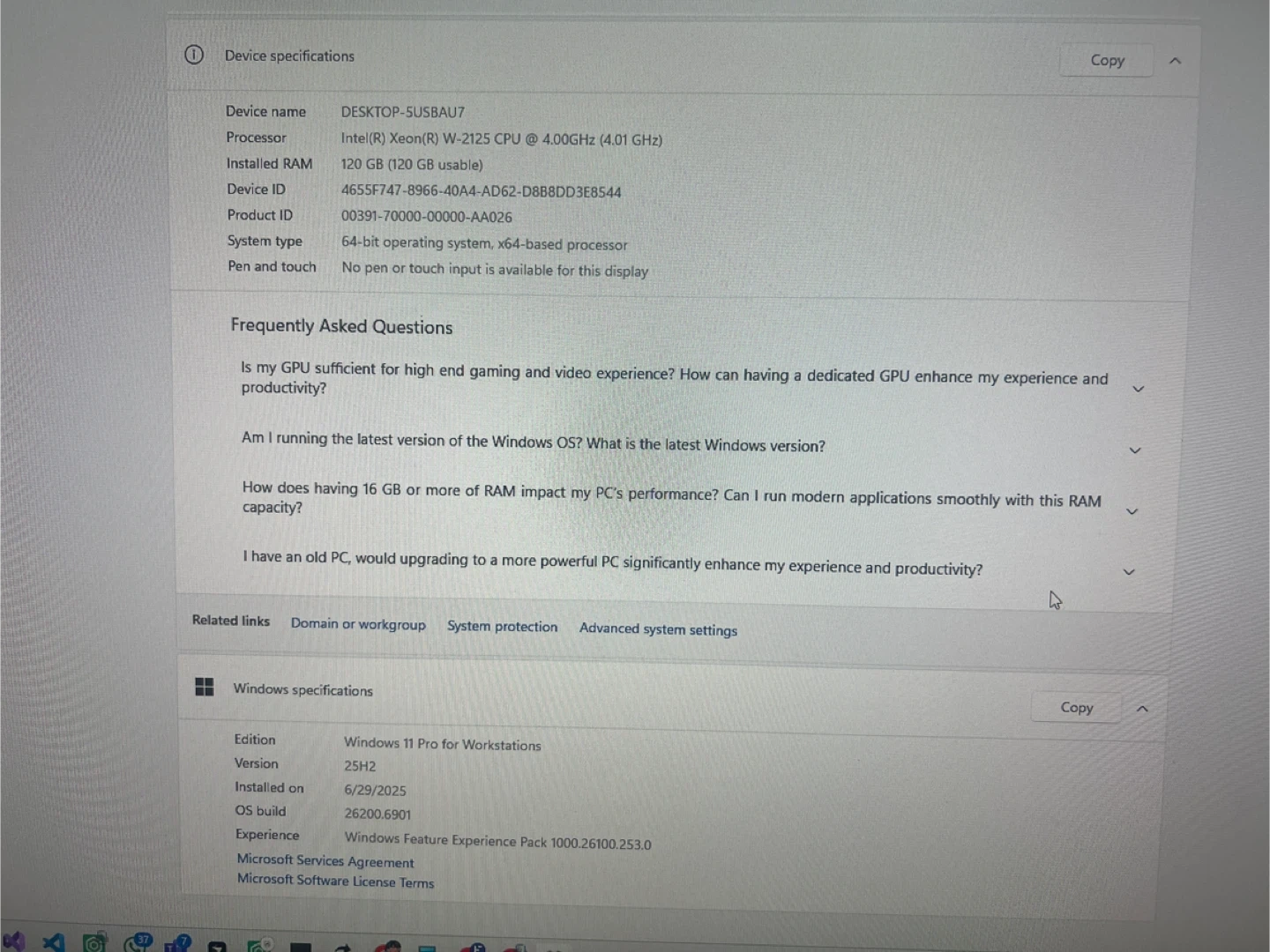 10Selling an HP Z4 Workstation PC. It comes with an Intel(R) Xeon(R) W-2125 CPU @ 4.00GHz (4.01 GHz) processor and 120 GB (120 GB usable) of installed RAM. It's running Windows 11 Pro for Workstations, version 25H2, installed on 2025 June 29