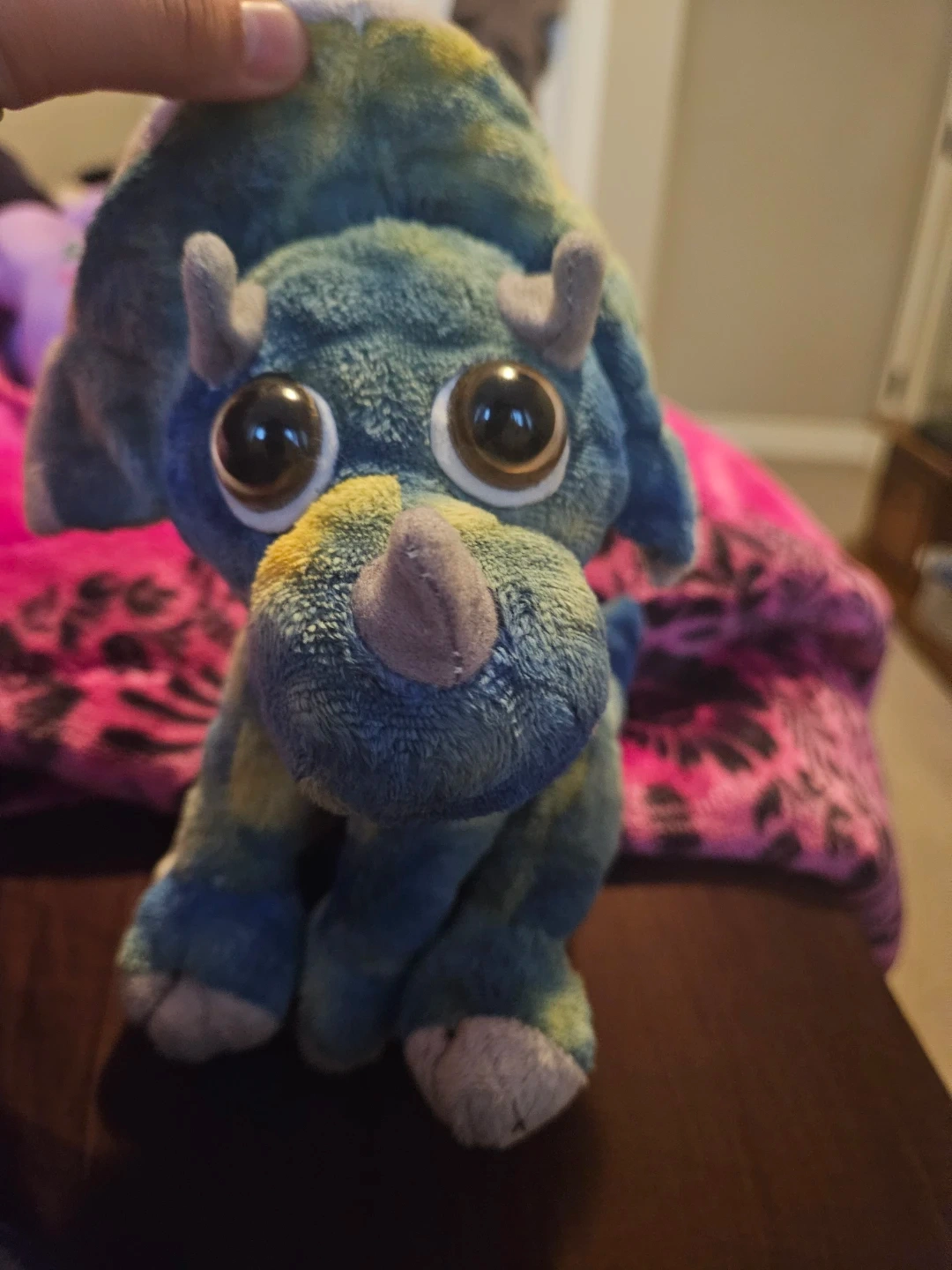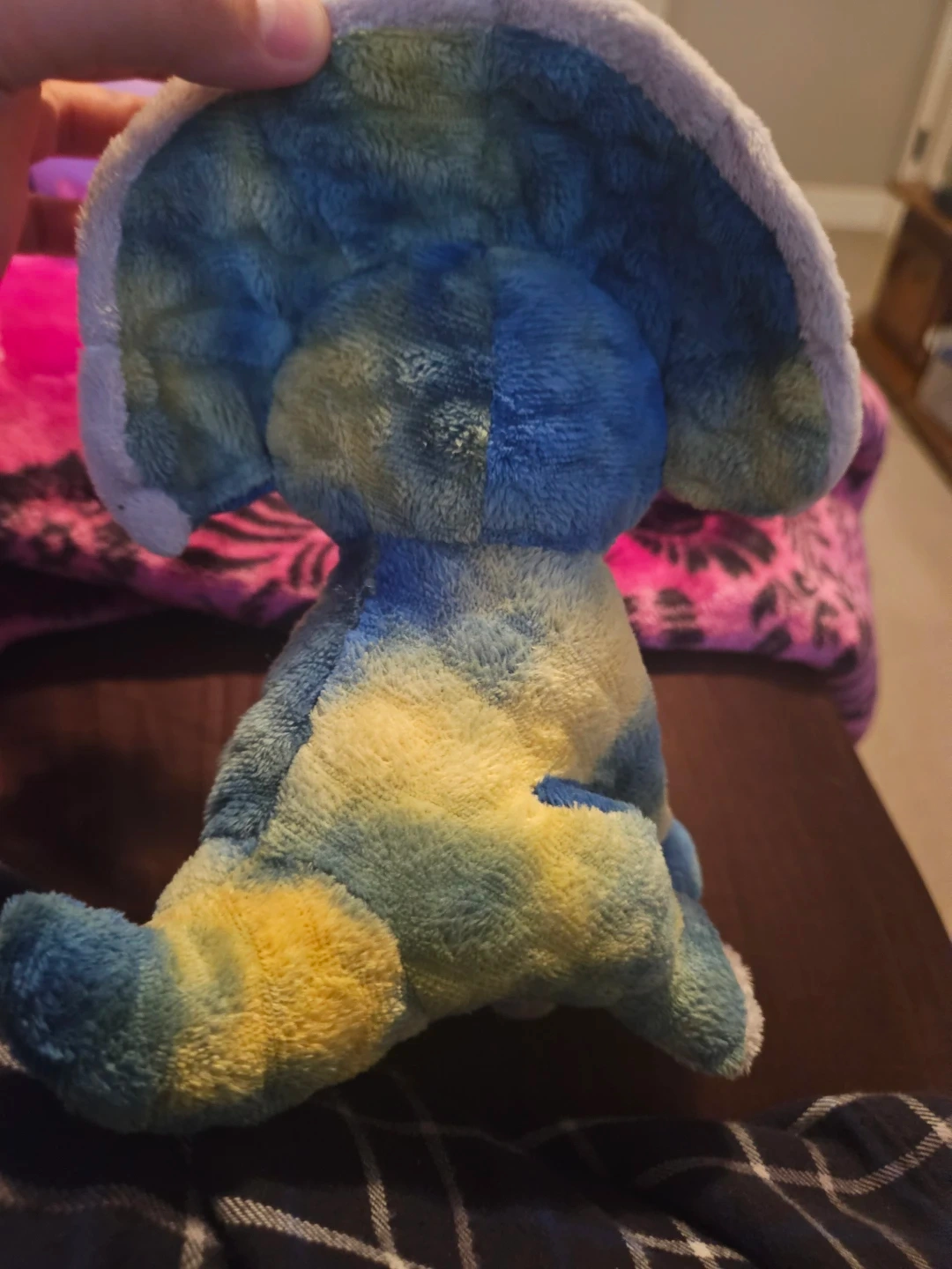 Soft plush toy in blue and yellow tie-dye colours. It's a cute dinosaur with big eyes and small horns. This plush would be a fun addition to a toy collection!