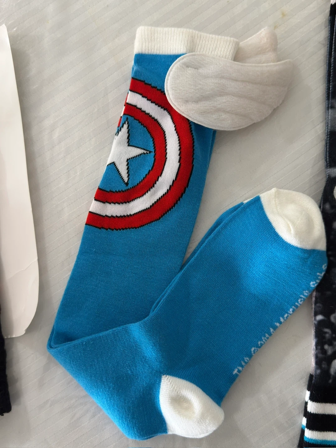 These knee-high socks feature Captain America's shield design and cute white wings. They're a fun addition to any Marvel fan's collection. Made from a comfortable fabric blend.