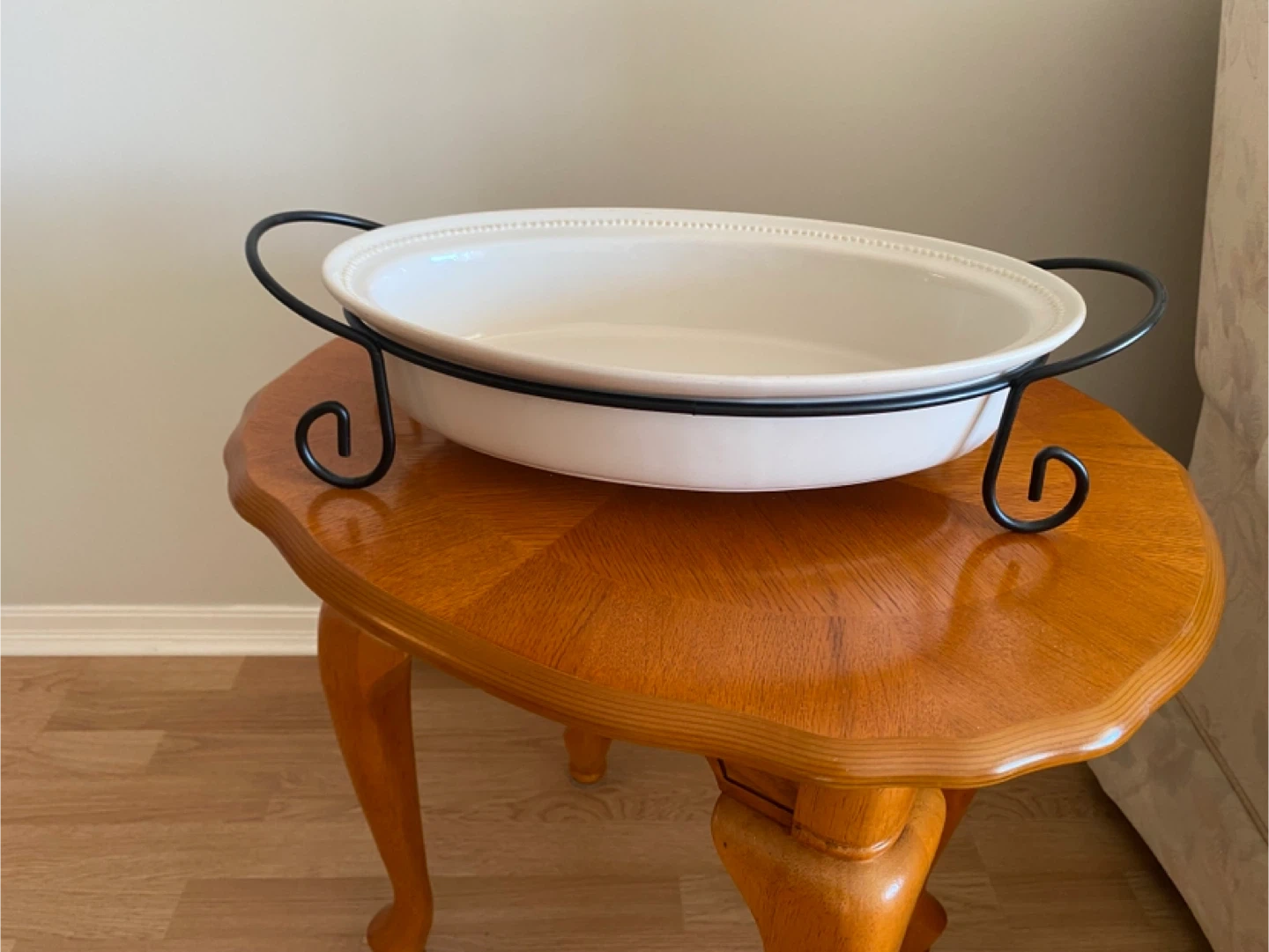 White oval ceramic baking dish with a decorative beaded edge. It comes with a black metal stand with handles. Dish is oven safe. Perfect for serving casseroles or roasts! Microwave, oven and dishwasher proof
