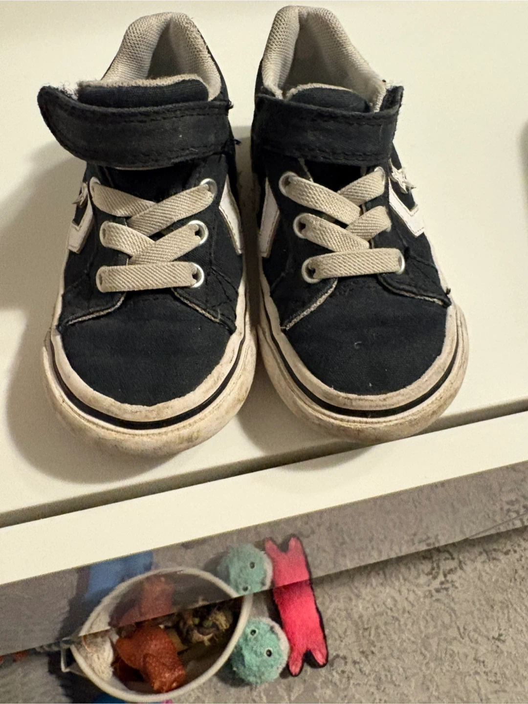Black Converse infant sneakers. Textile upper and lining. Rubber outsole. Hook-and-loop strap for easy on and off. Size 7.