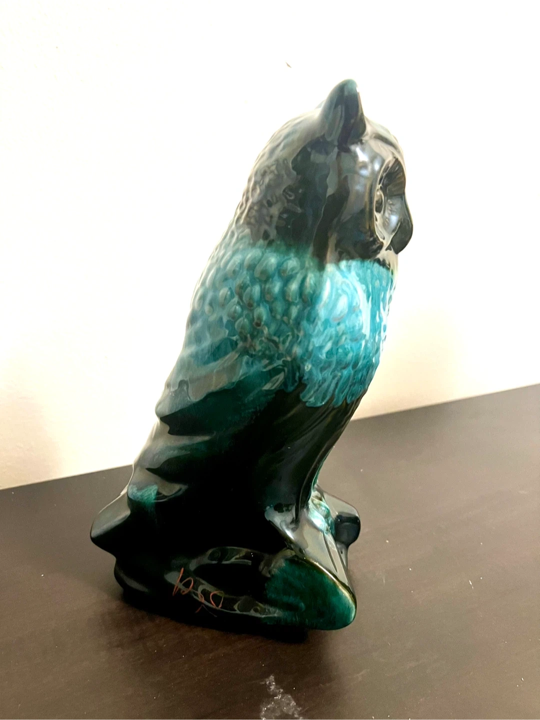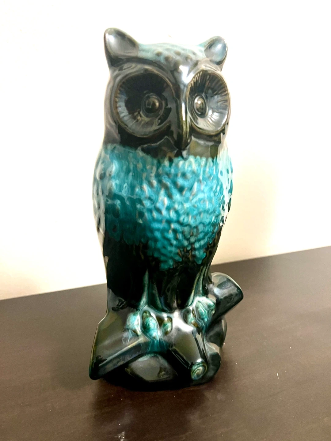 A decorative ceramic owl figurine with a glossy teal and dark green finish. This piece features intricate detailing on its feathers and eyes. It's a lovely accent for any shelf or desk.