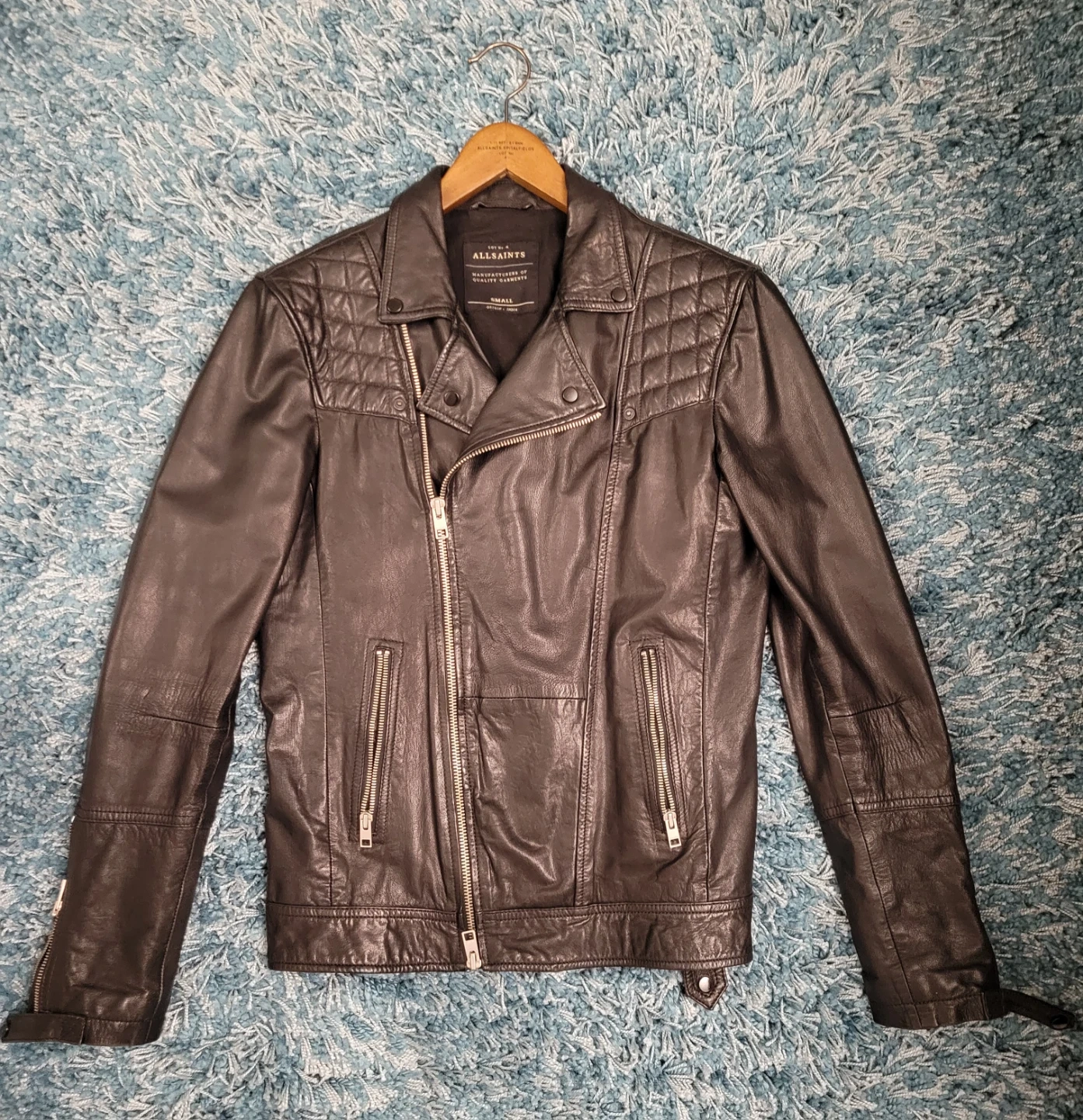 Here's a stylish AllSaints leather biker jacket in size Small. It's in great shape and ready for a new owner! The jacket is made from quality materials and has a classic design that will never go out of style.