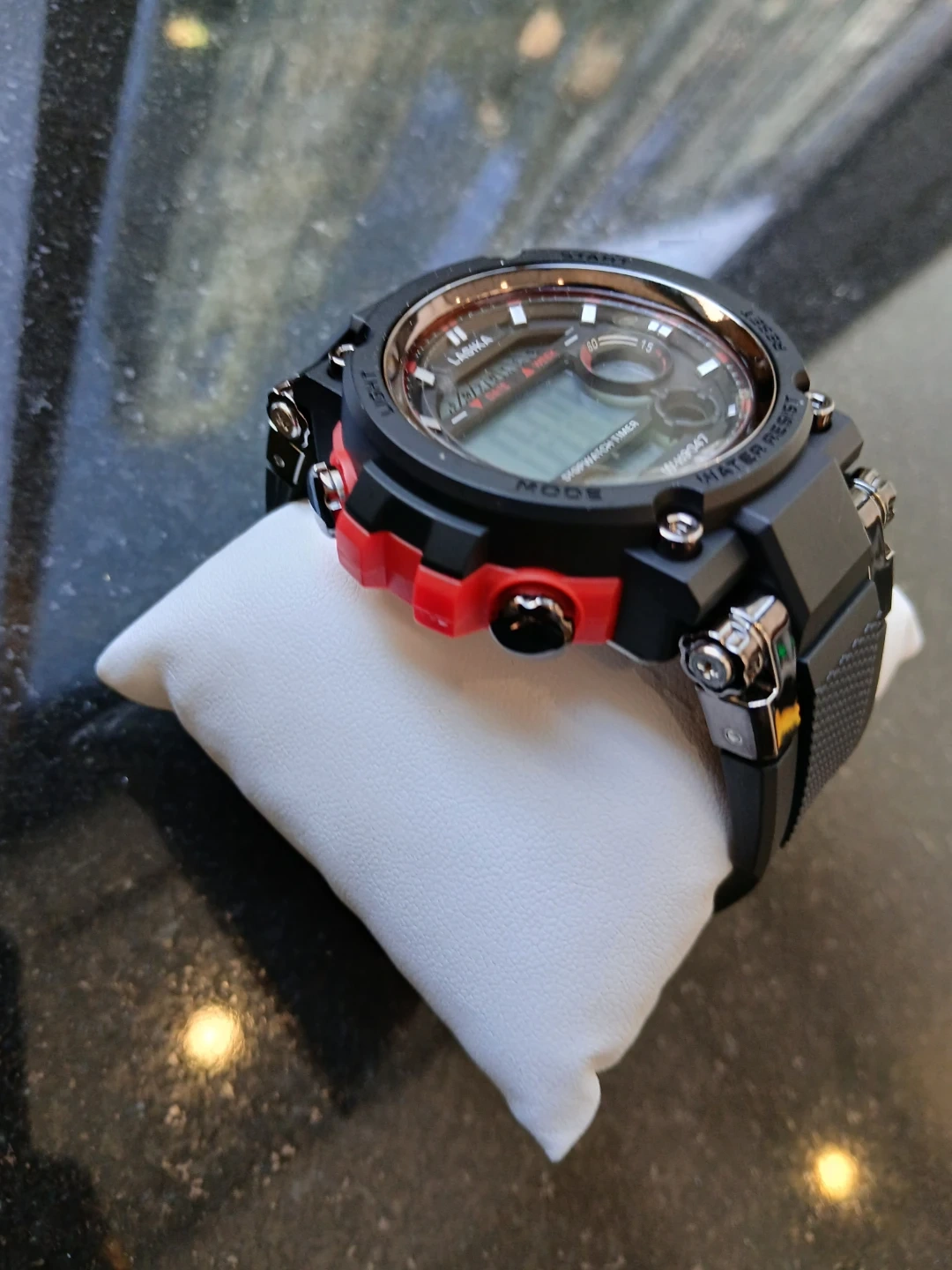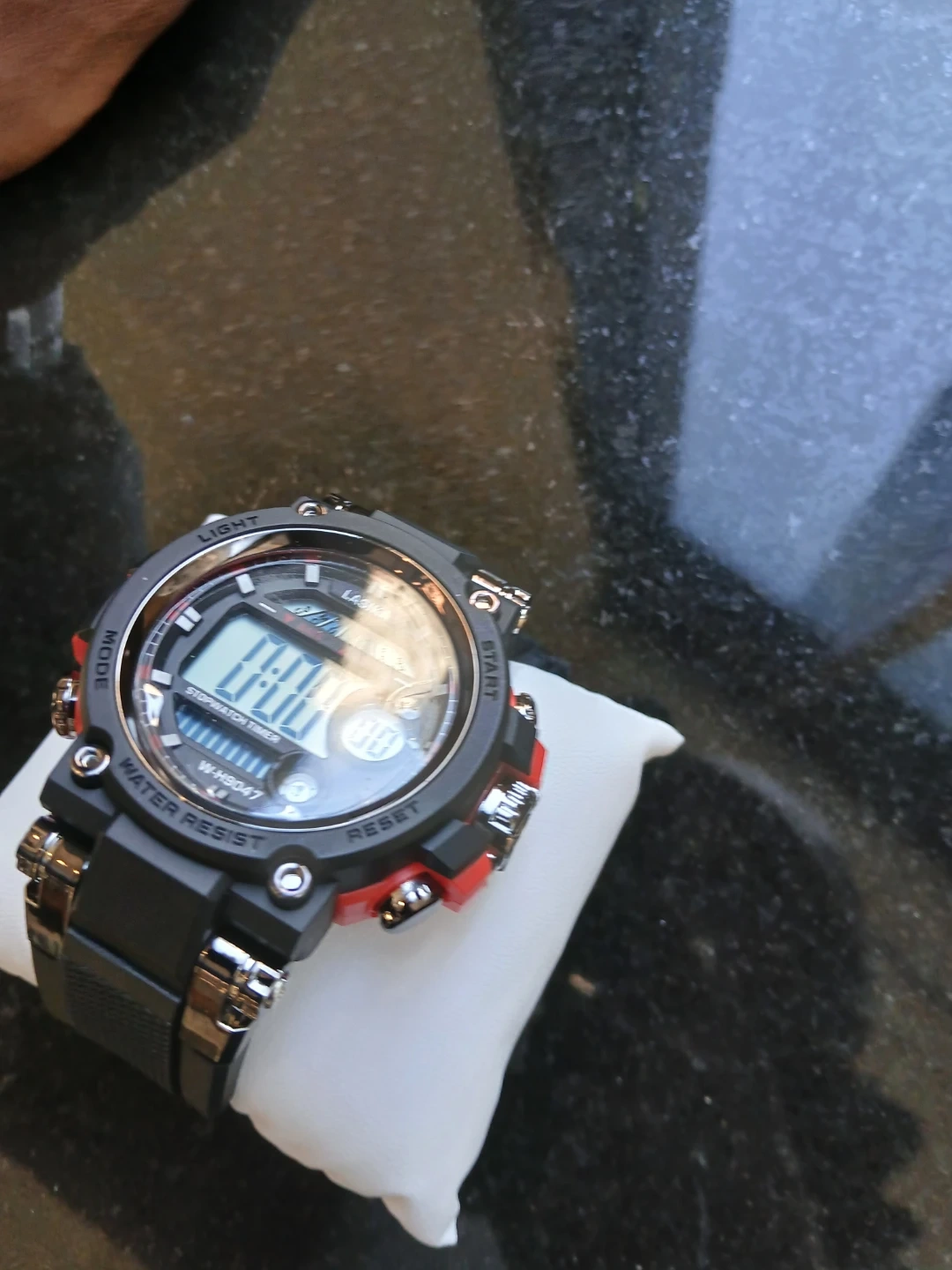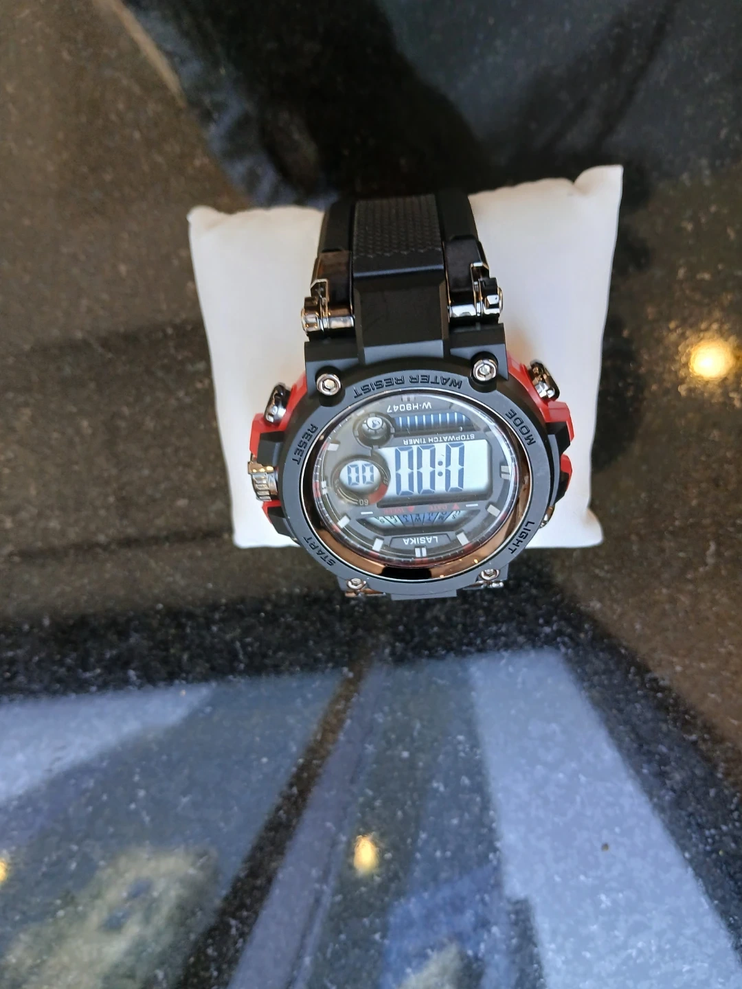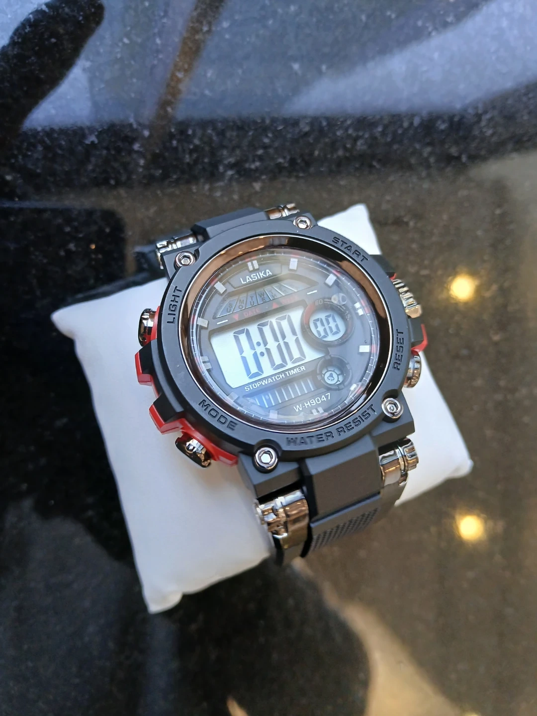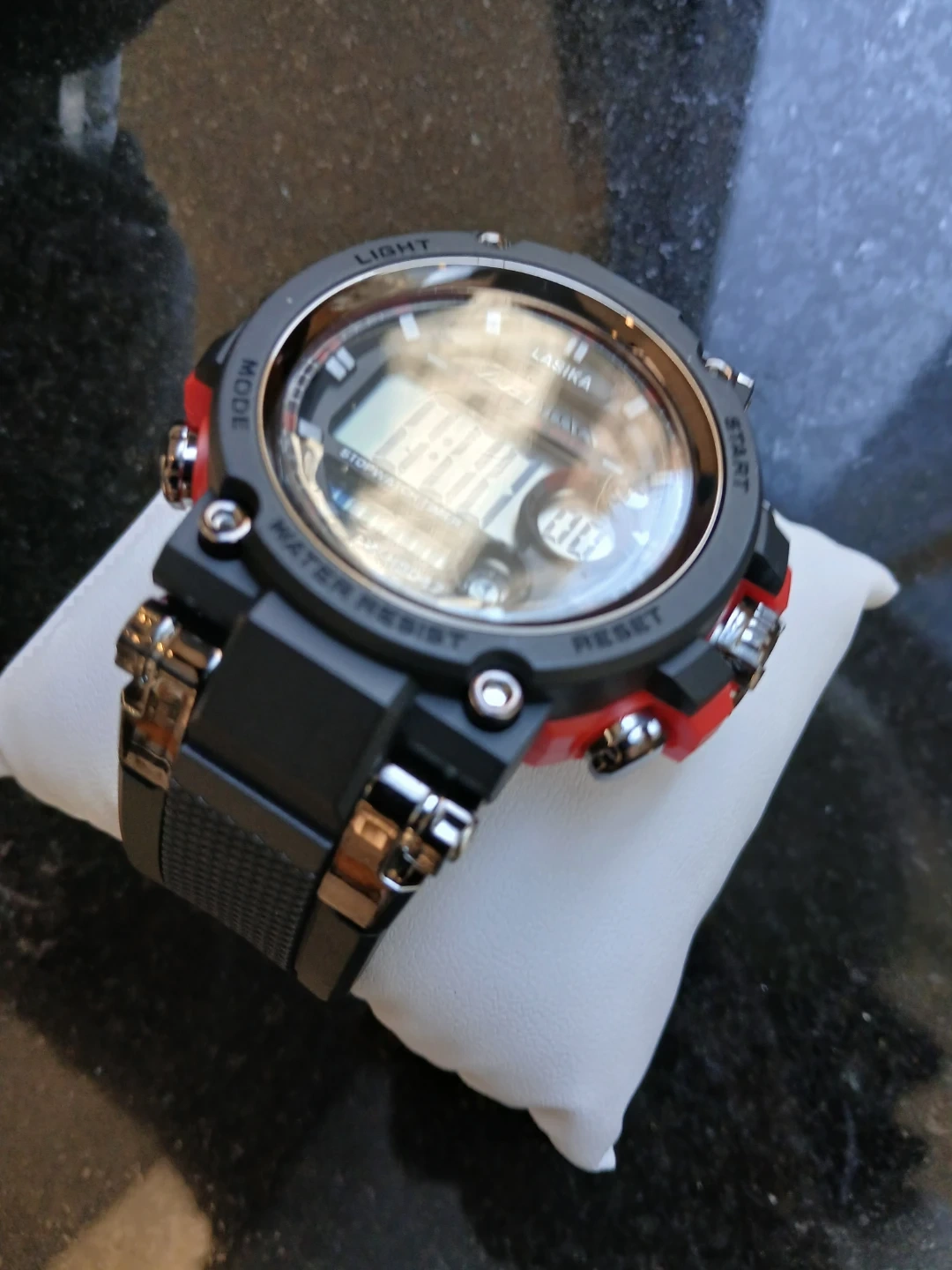 LASIKA digital watch with stopwatch timer function. Features water resistance. Black band with red accents. $25