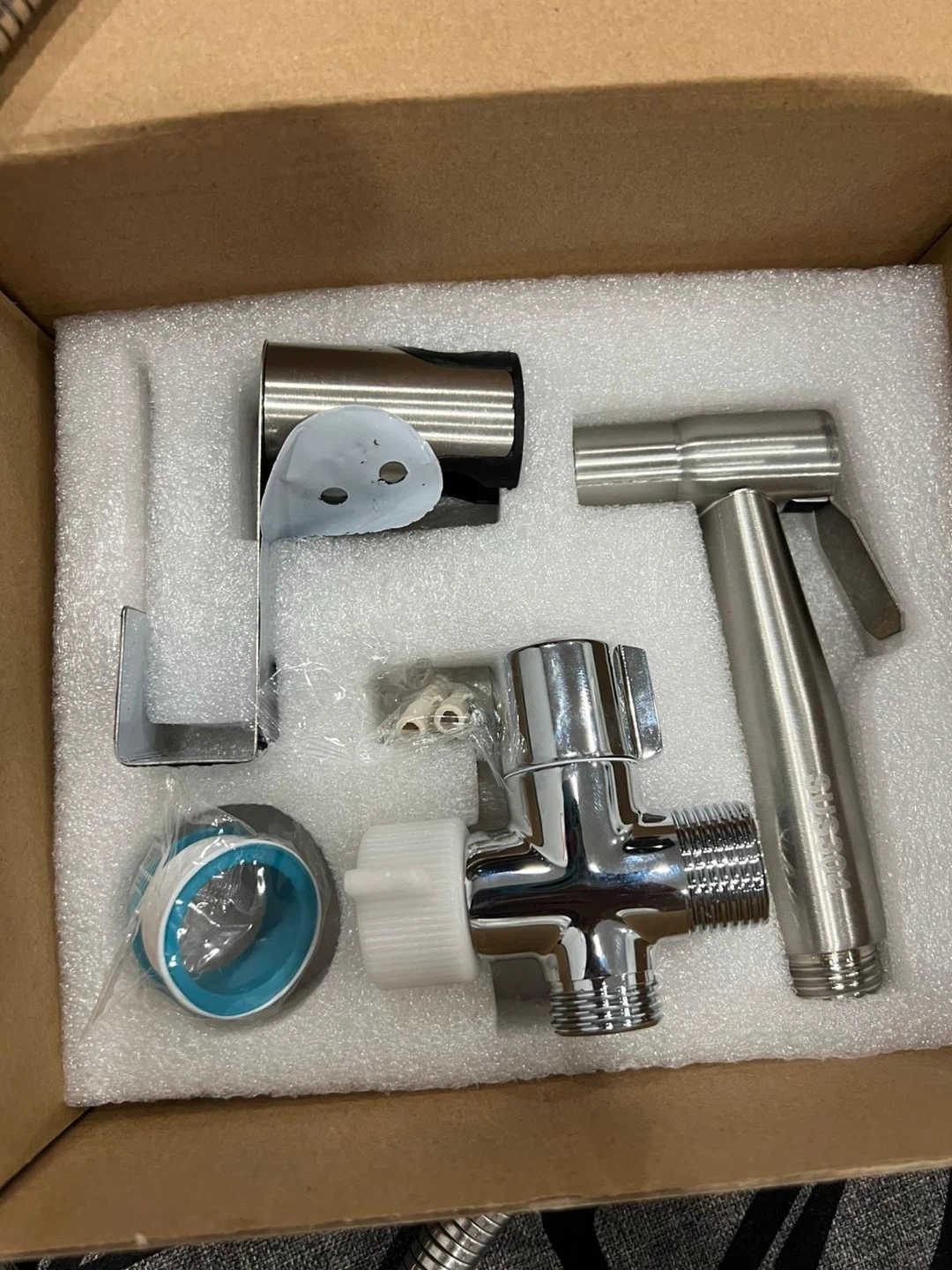 This bidet sprayer set is made of stainless steel. It includes a sprayer, hose, T-valve, and wall mount bracket. Installation is straightforward for most bathrooms.