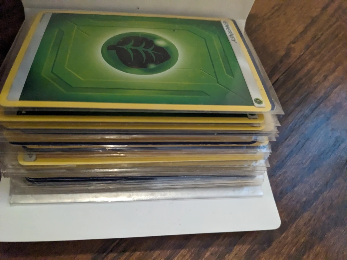 A collection of Pokémon Trading Card Game energy cards, specifically featuring Grass energy. These cards are essential for powering up your Pokémon during battles. They come in protective sleeves inside the original box.