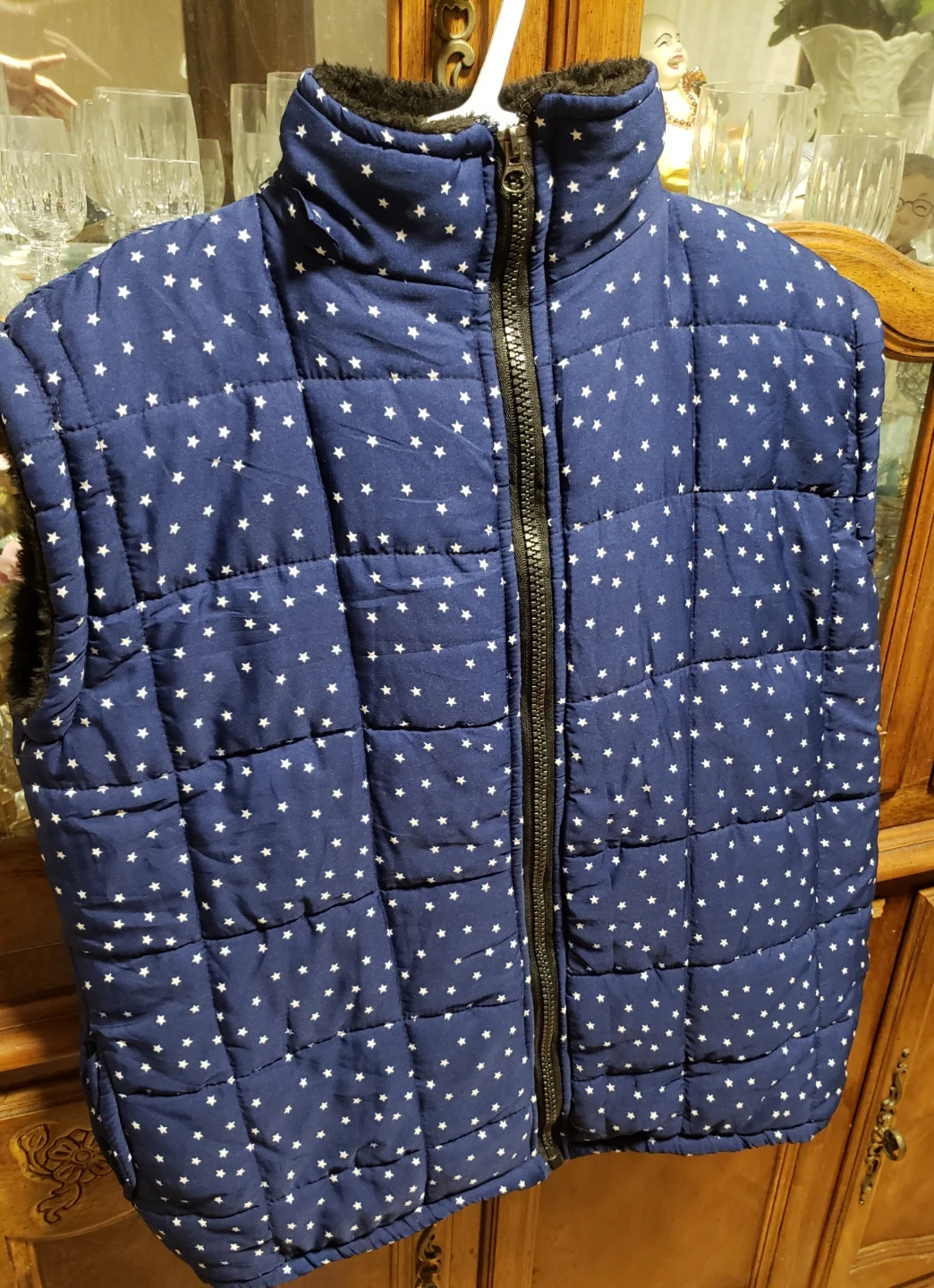 Blue puffer vest with a white star pattern. It's lined with fuzzy black material for extra warmth and has a full zipper closure. The hood is attached and can be zipped away into the collar.