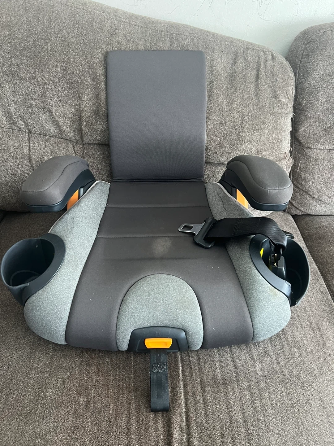 This is a Graco booster car seat with two cup holders. It has a padded headrest and adjustable armrests. It's designed for children who have outgrown a forward-facing harness.